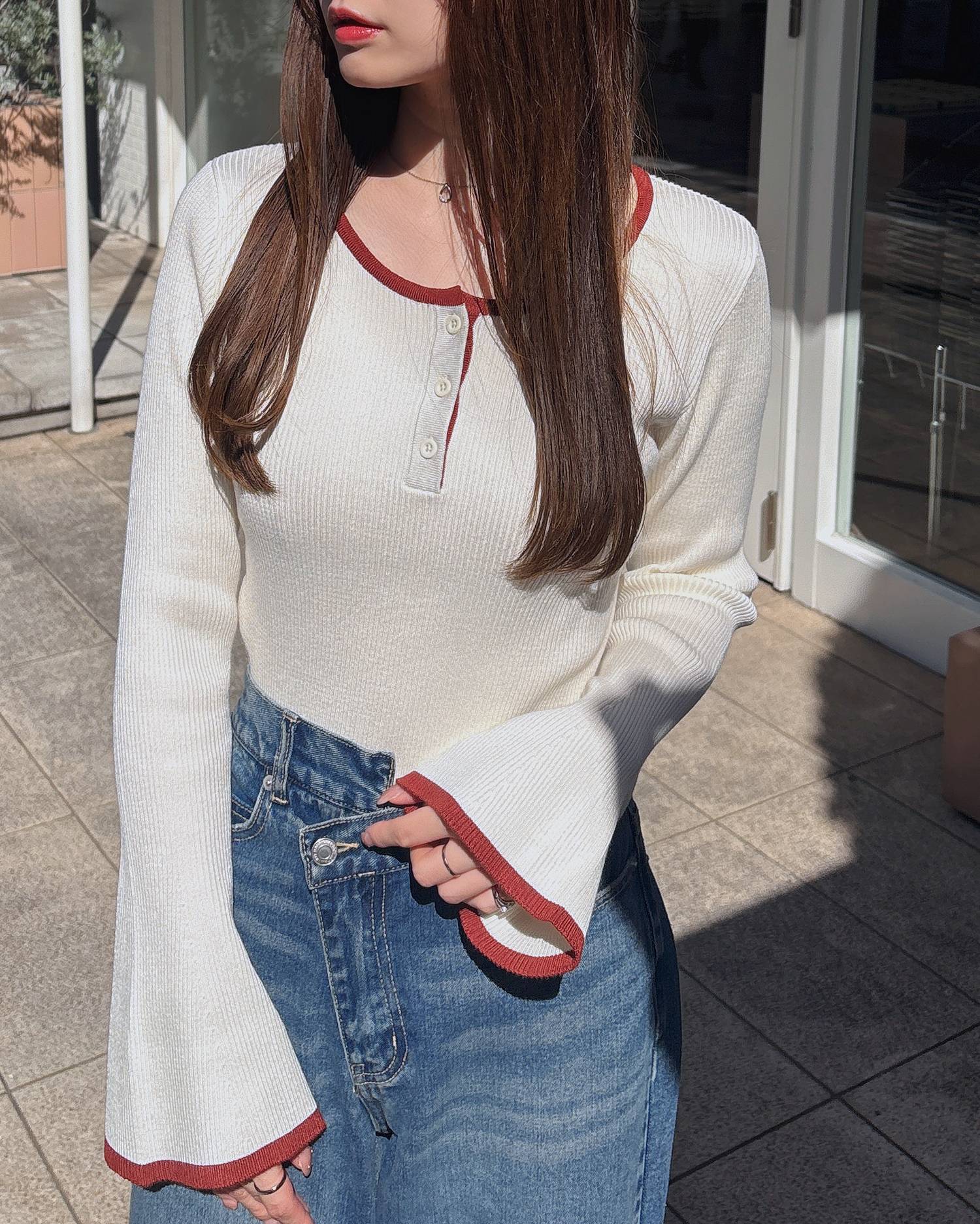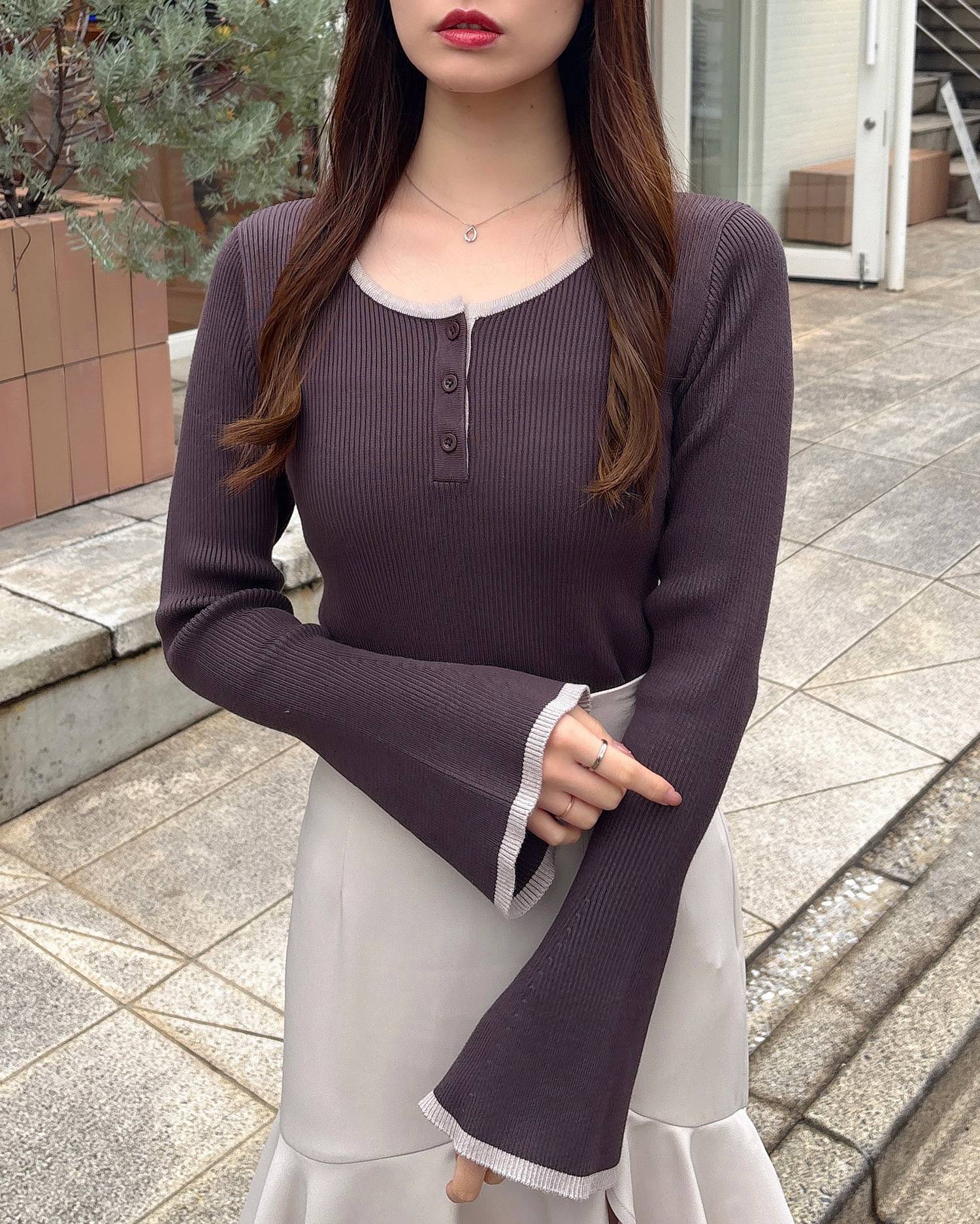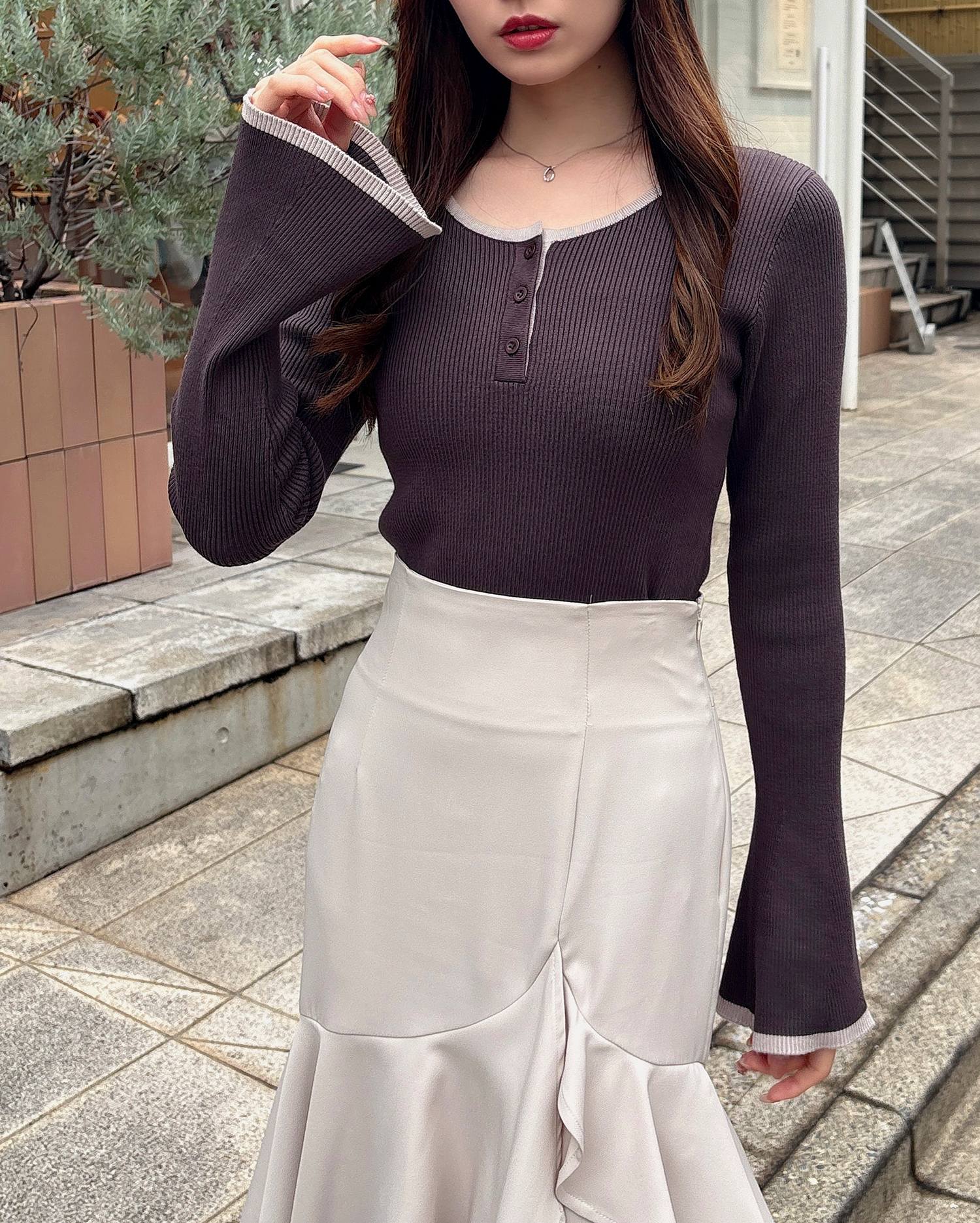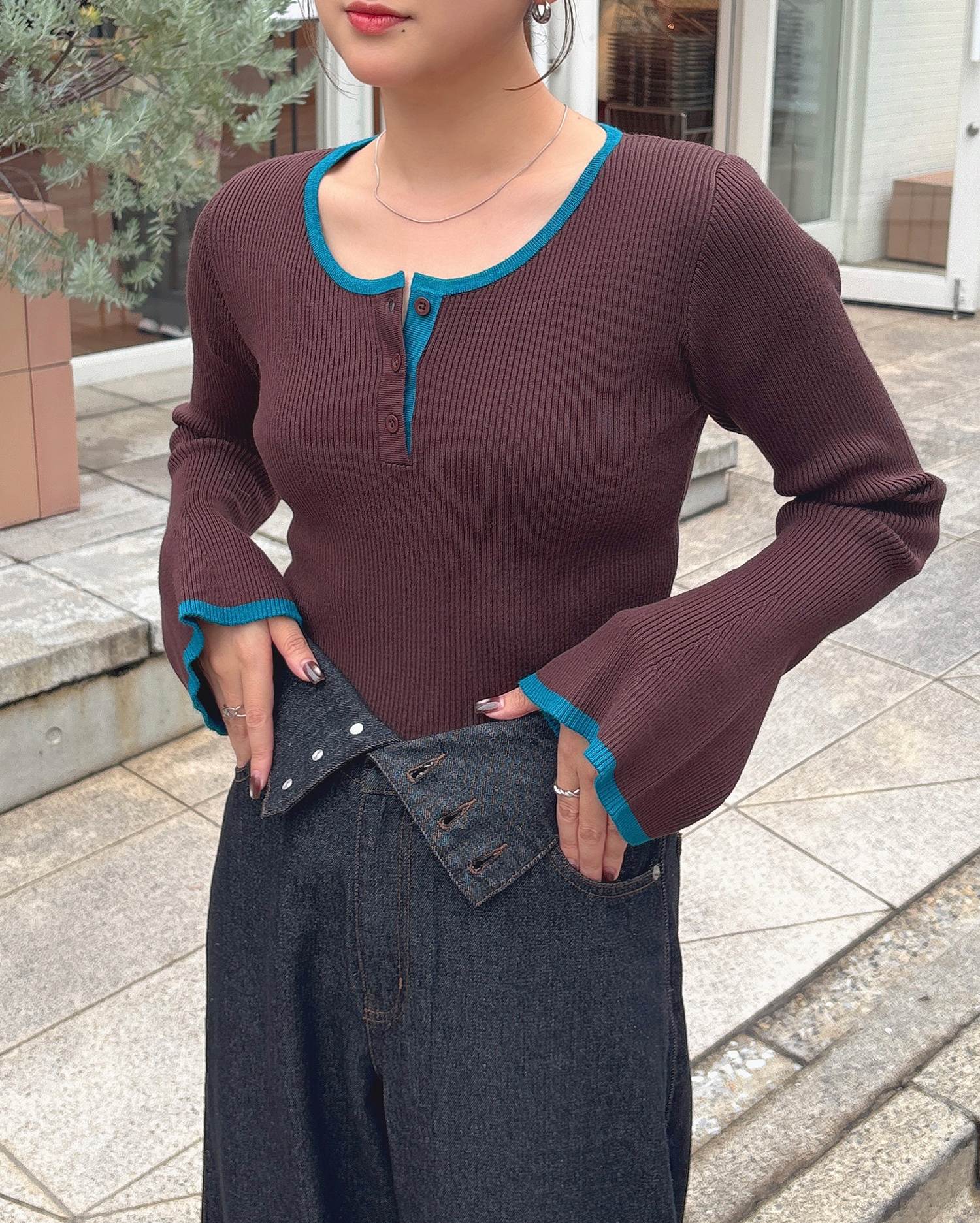 バイカラーとフレアスリーブがアクセントのニットトップス。