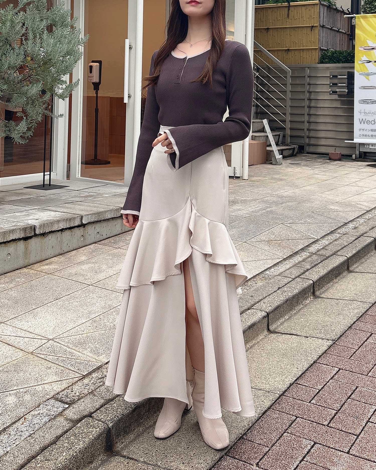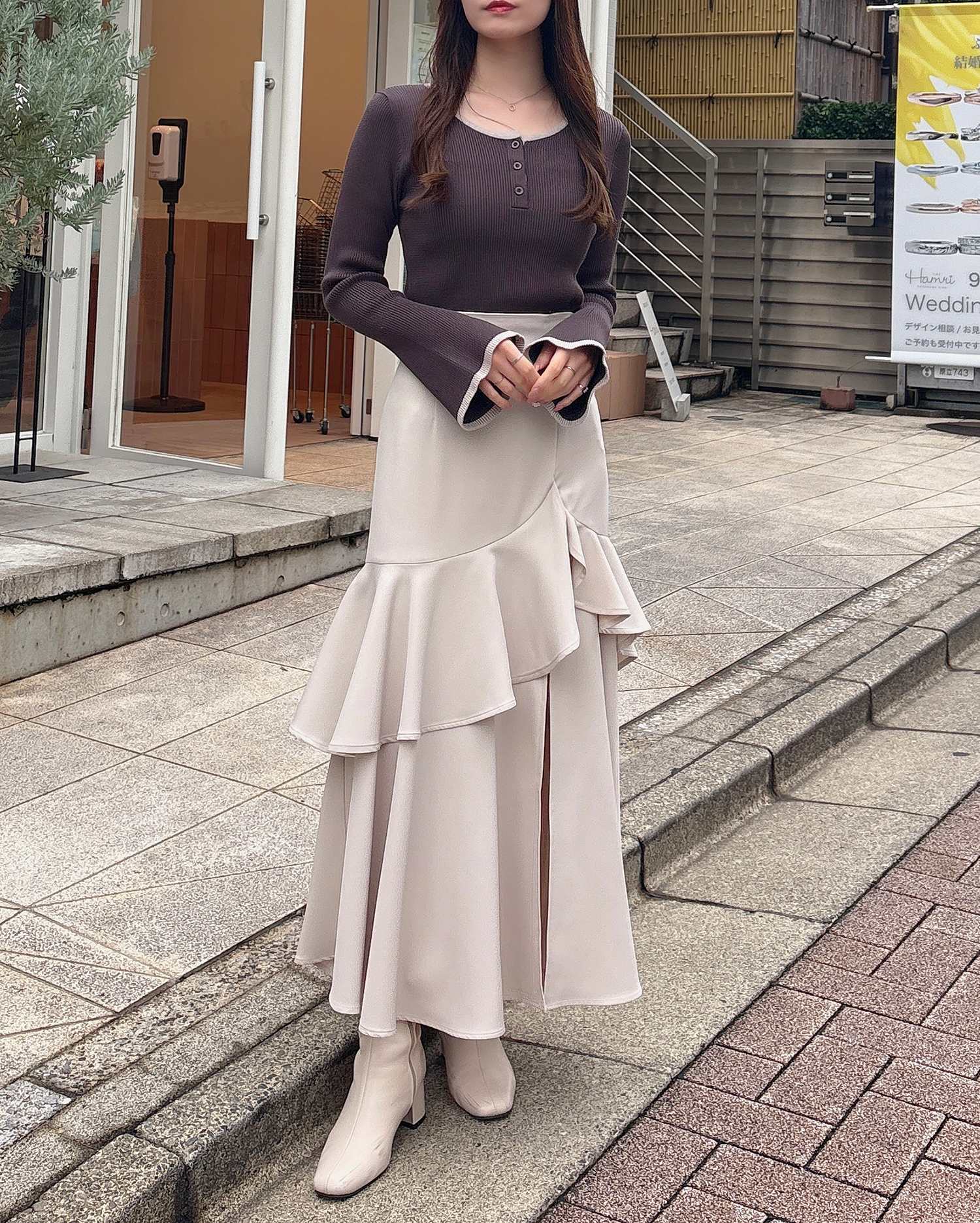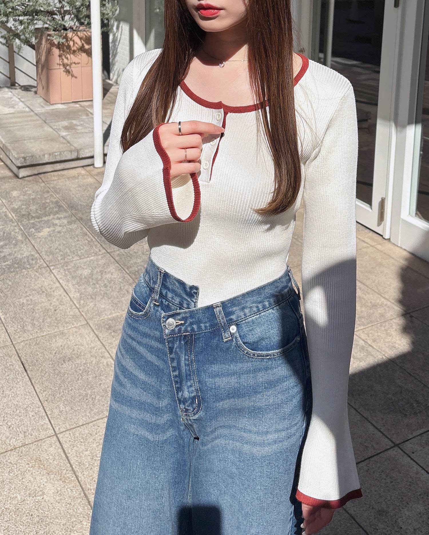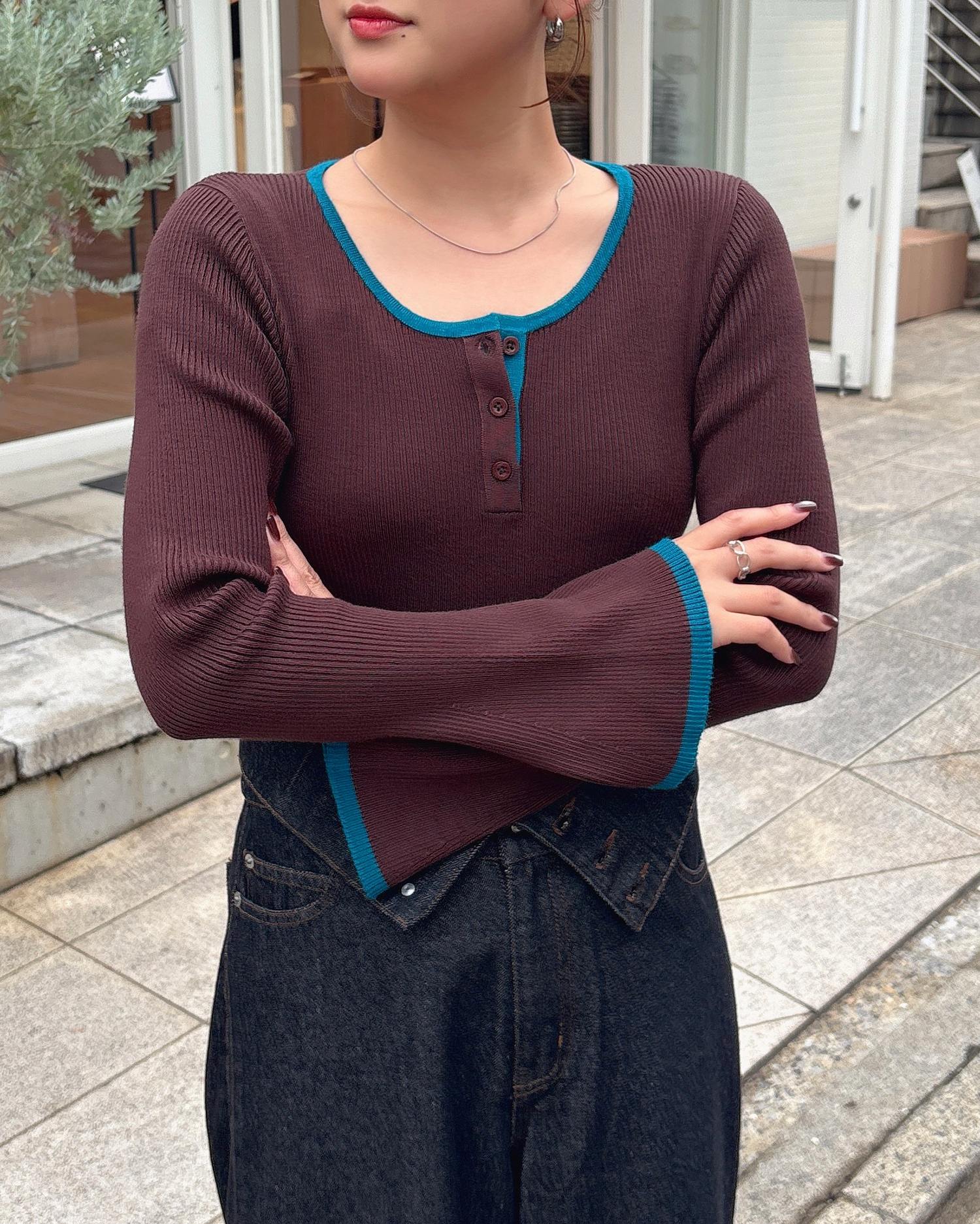 バイカラーとフレアスリーブがアクセントのニットトップス。
