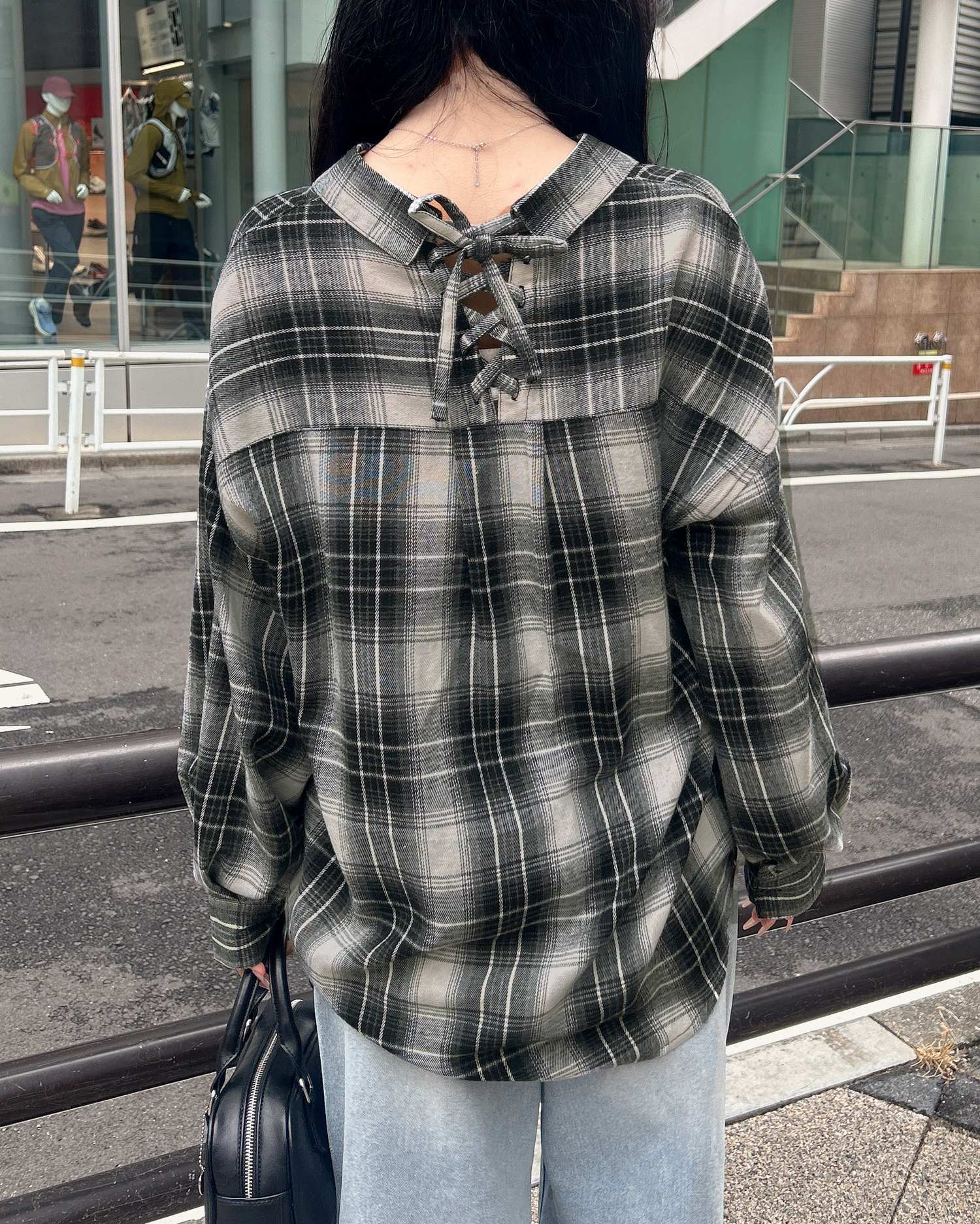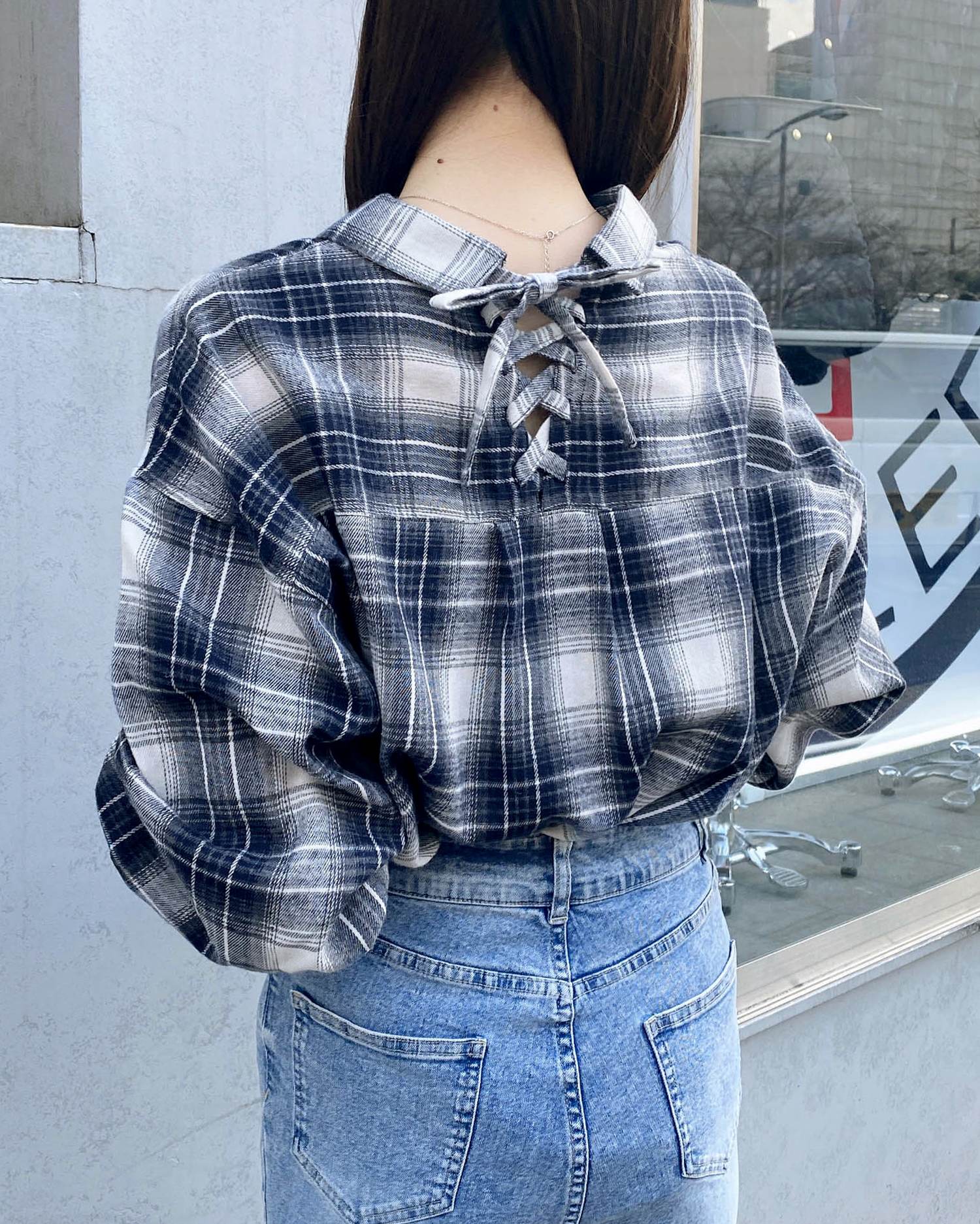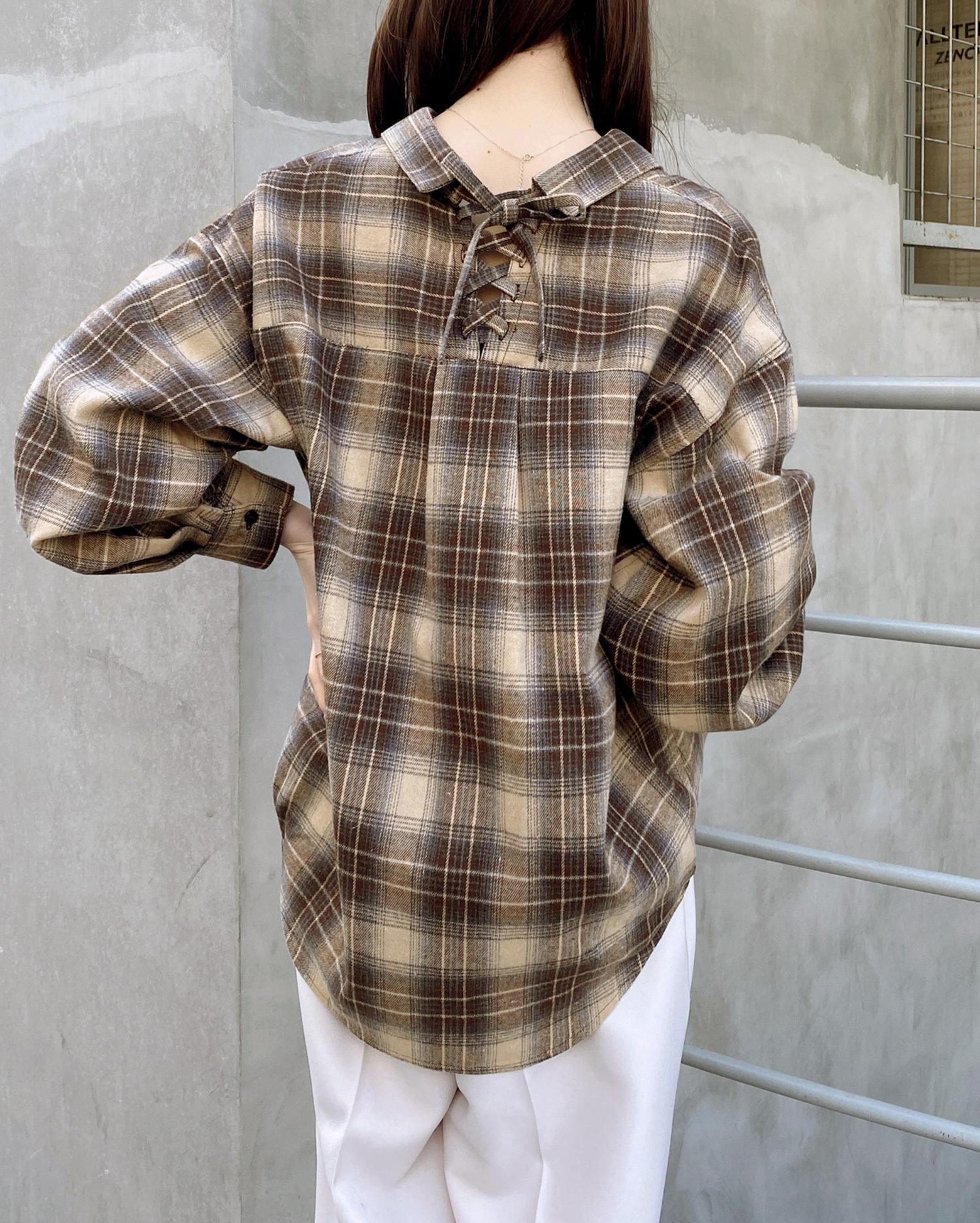 バックのレースアップデザインが抜け感を演出するチェック柄シャツ。