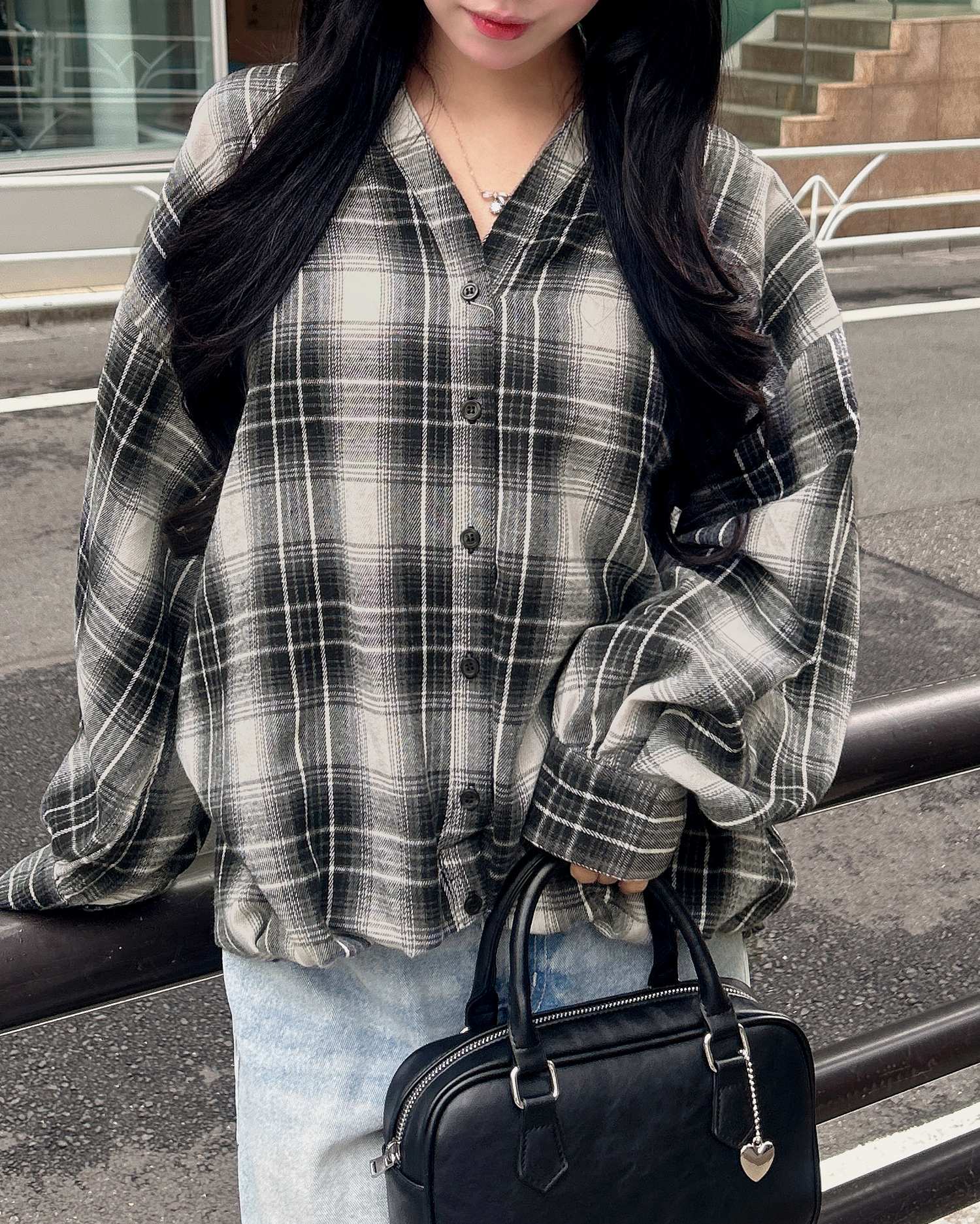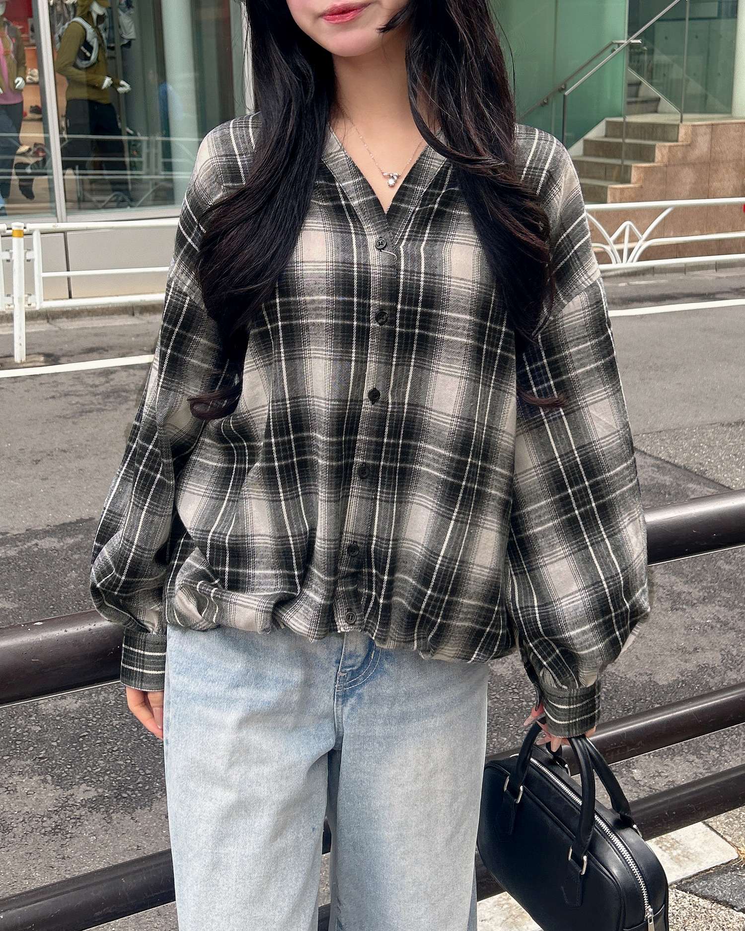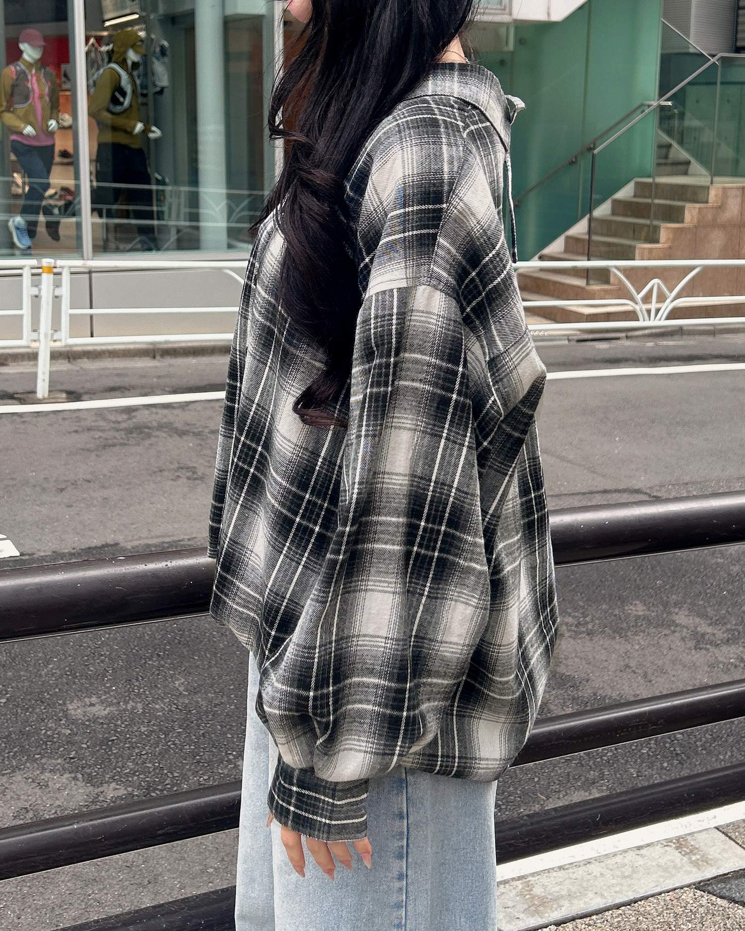 バックのレースアップデザインが抜け感を演出するチェック柄シャツ。