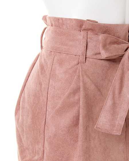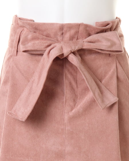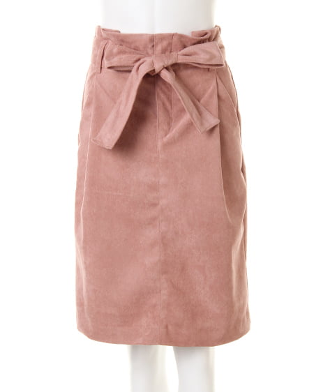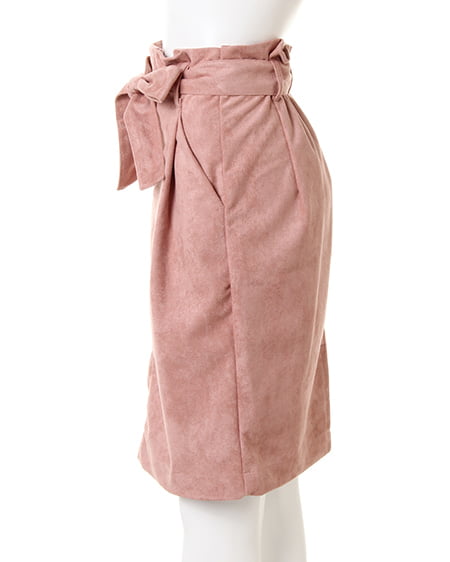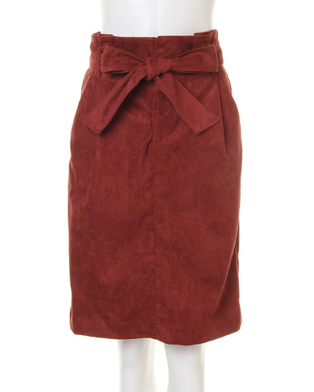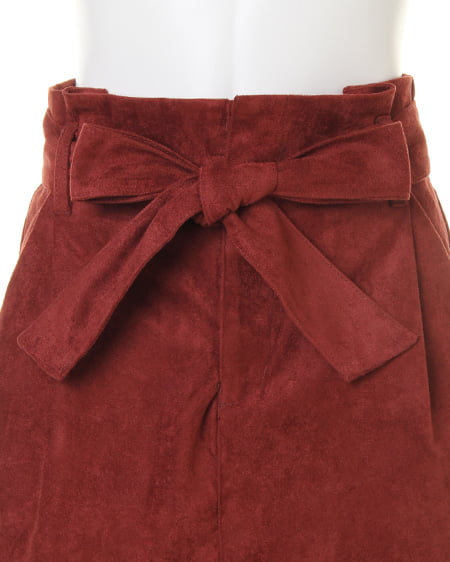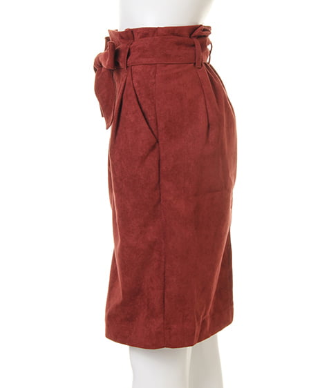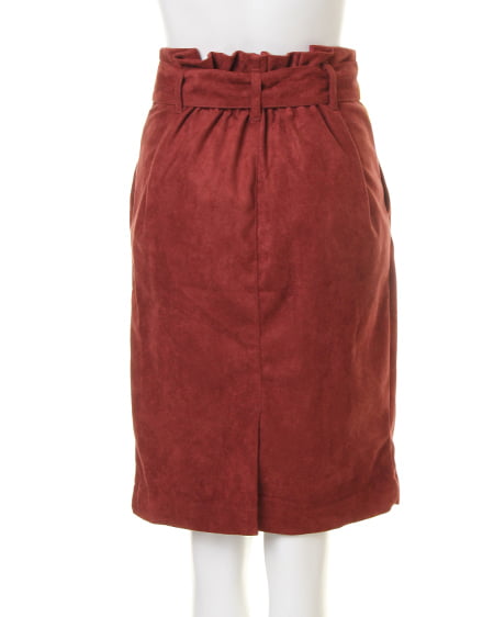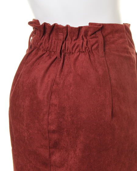 起毛感のあるフェイクスウェード素材を使った、タイトシルエットのスカート。裾丈を長めに設定することで、大人っぽく落ち着いた印象に仕上げています。ウエスト部分はゴムになっていて穿き心地も◎。ウエスト上部を長めにし、フリルのようなデザインにしているので、トップスインスタイルもスタイリッシュにキマります。共布ベルト付き。