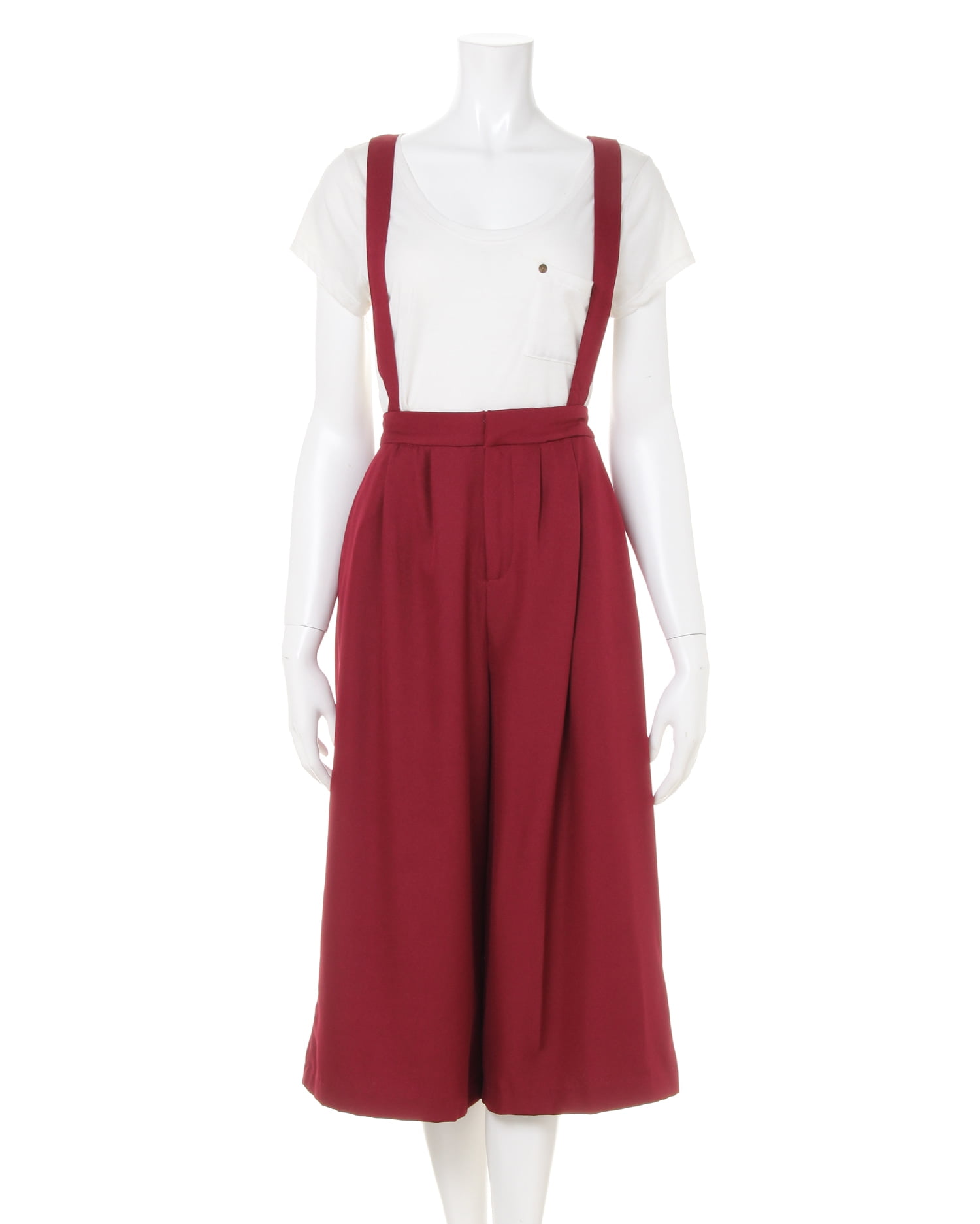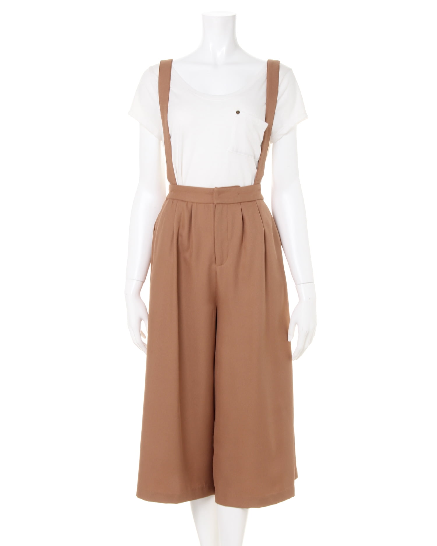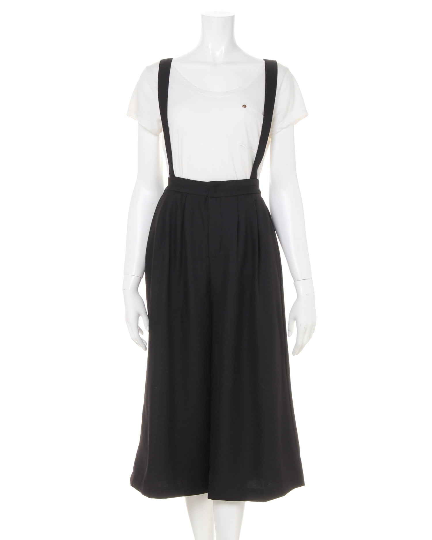 着こなしの幅が広がるサスペンダー付きのガウチョパンツ。ひざ下の程よい丈感でバランスよく着こなせます。ハリ感のある素材は伸縮性があり、脱ぎ穿きも楽チン。ウエスト部分はゴムになっているので、リラックスした着心地を楽しめます。合わせるトップス次第で様々な着こなしができるのが嬉しい。カットソーでカジュアルに、フリルブラウスでクラシカルなスタイルも◎。