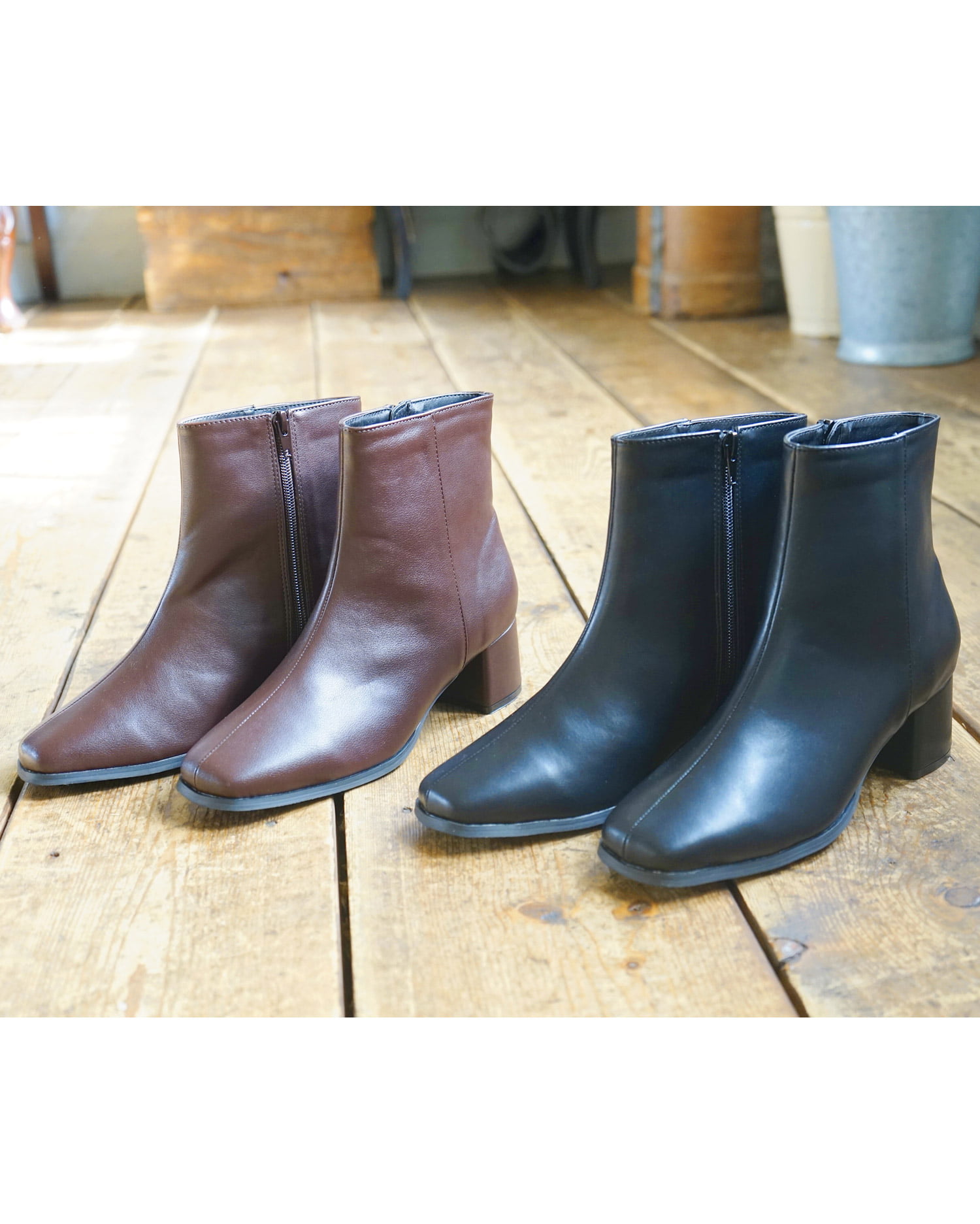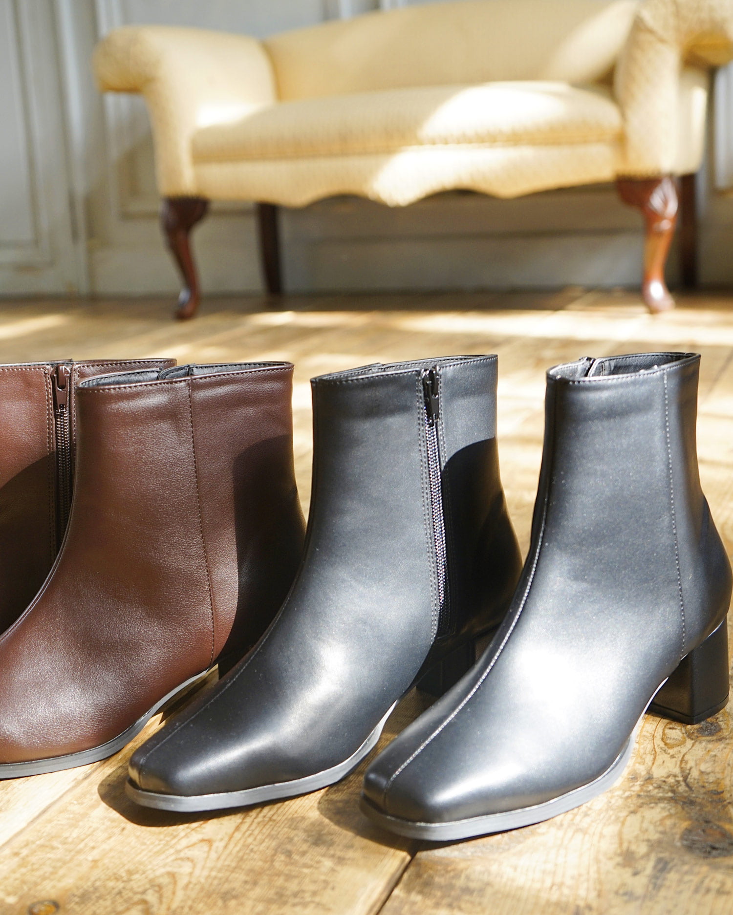 どんなスタイルにも馴染むシンプルデザインで使い勝手のいいショートブーツ。シンプルながらつま先のスクエアシルエットが魅力のトレンド感漂う技ありアイテムです。安定感のあるヒールで歩きやすく、歩行をアシストしてくれるので疲れにくいのも嬉しいポイント。サイドにはファスナーを付けているのでさっと脱ぎ穿きが出来るのも◎。 合わせやすいベーシックカラーを揃えました。