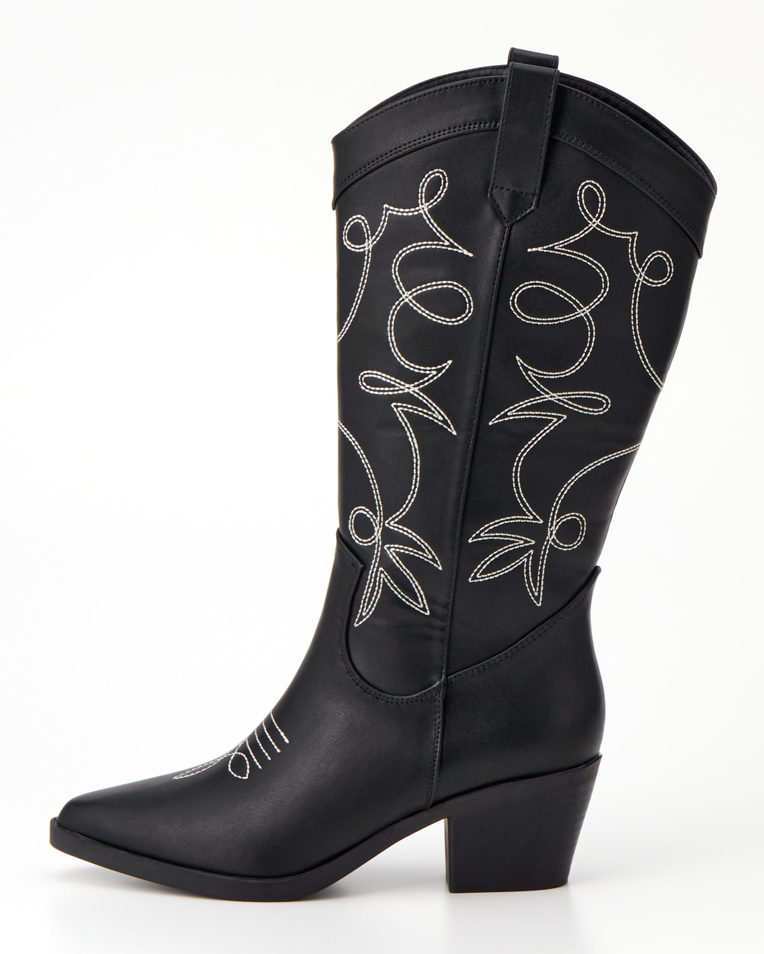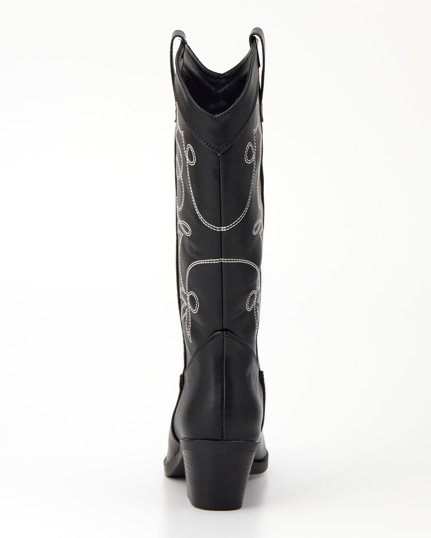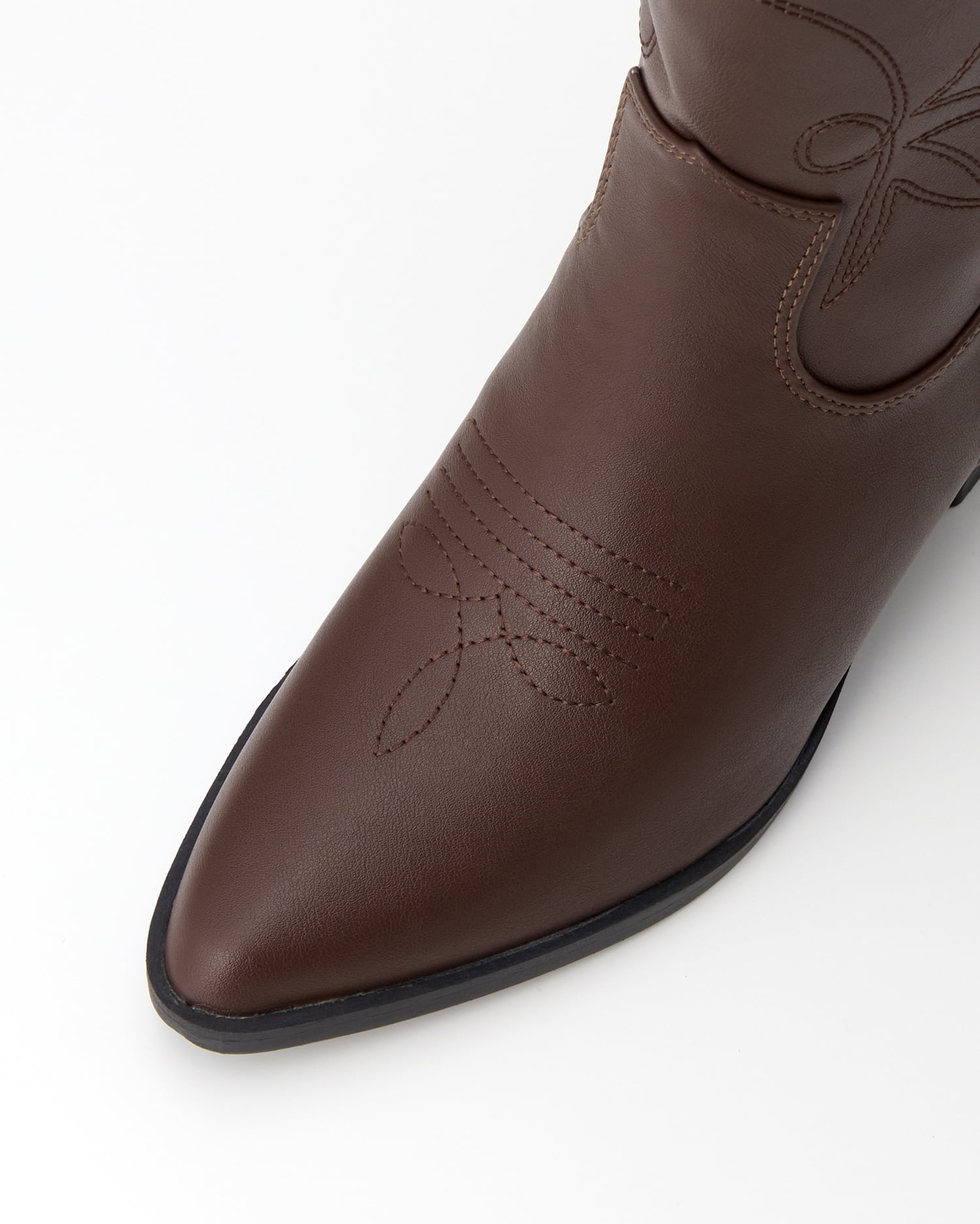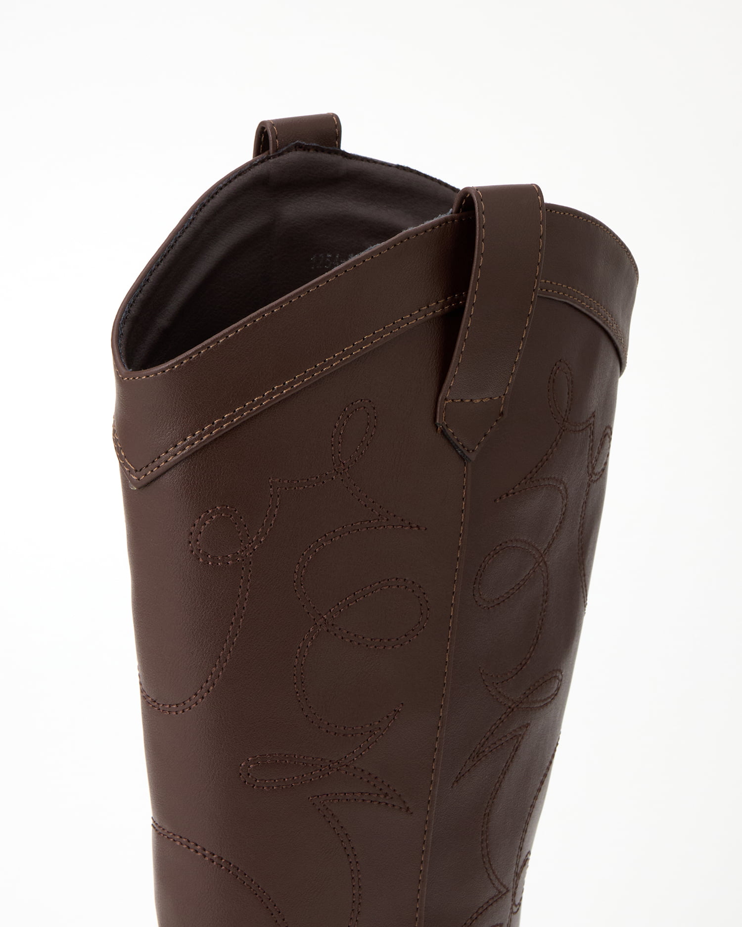 光沢を抑えたしなやかなフェイクレザーとステッチ刺繍がポイントのブーツ。