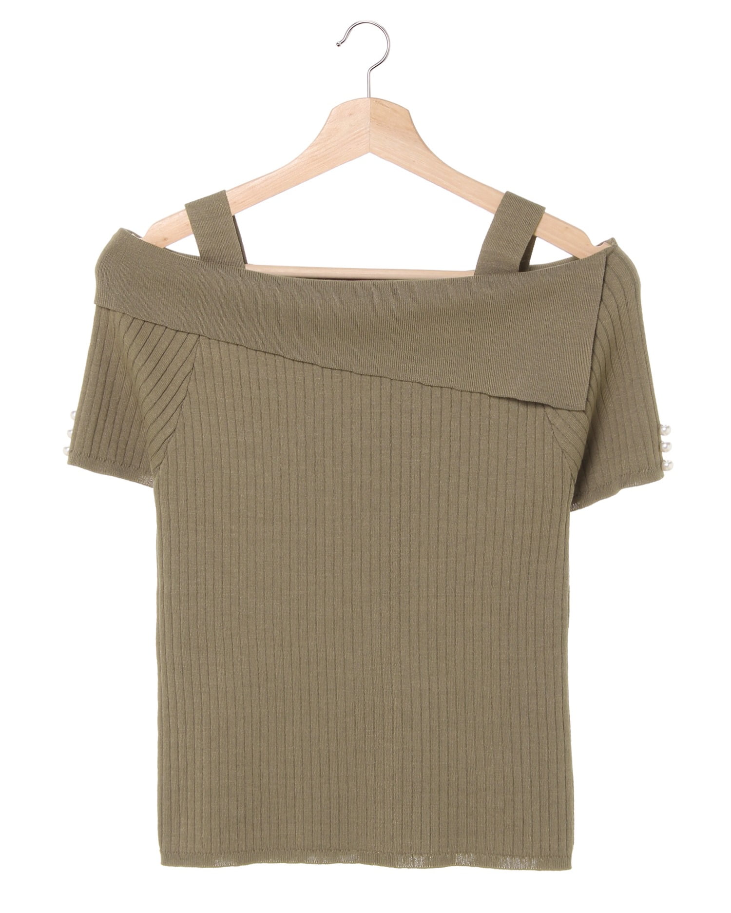 薄手のニットで通気性も抜群な半袖トップスは、アシンメトリーな折返しデザインとオフショルダーが新鮮。柔らかく伸縮性のあるリブ素材で着心地も快適です。程よいハリのある生地はラインを綺麗にキープ、女性らしいフェミニンな雰囲気を演出。袖のパール装飾が着こなしのアクセントに。程よい長さのフラットな裾丈で、トップスインスタイルもスムーズに決まるのが嬉しい。