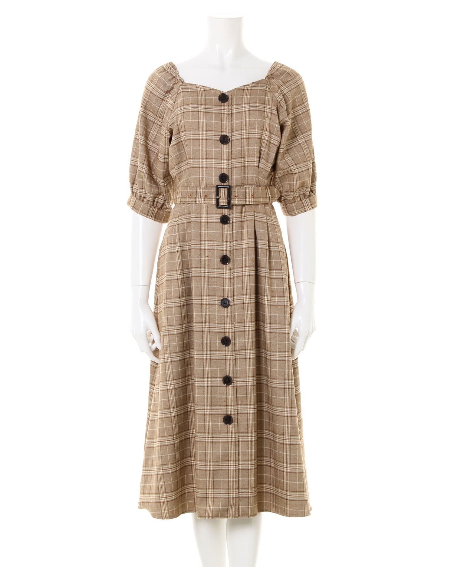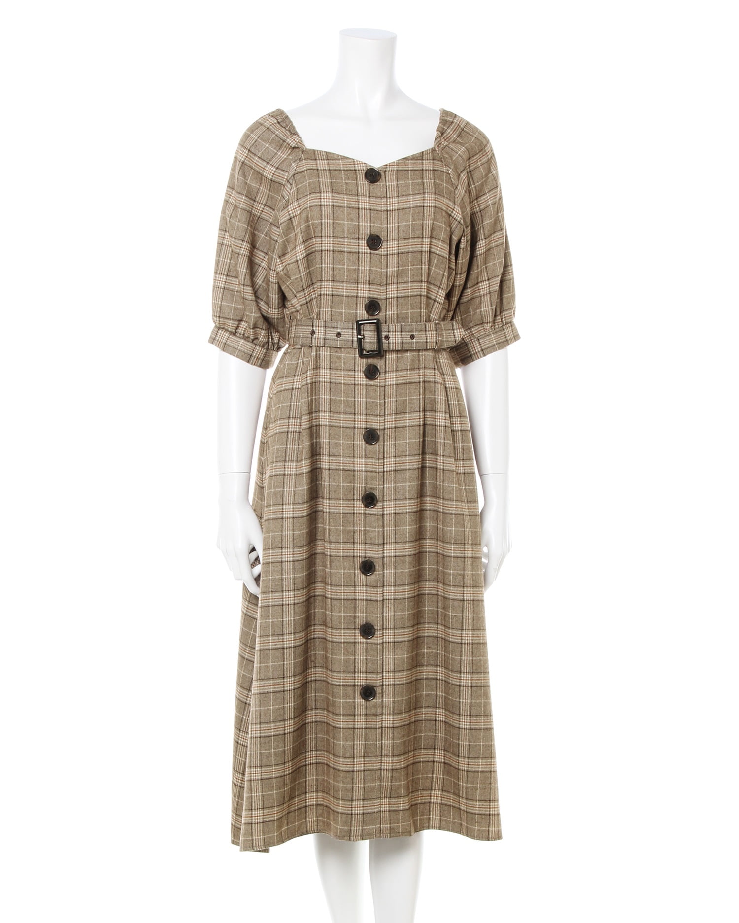 • allamanda(アラマンダ) チェック柄ベルト付きロングワンピース キャメル