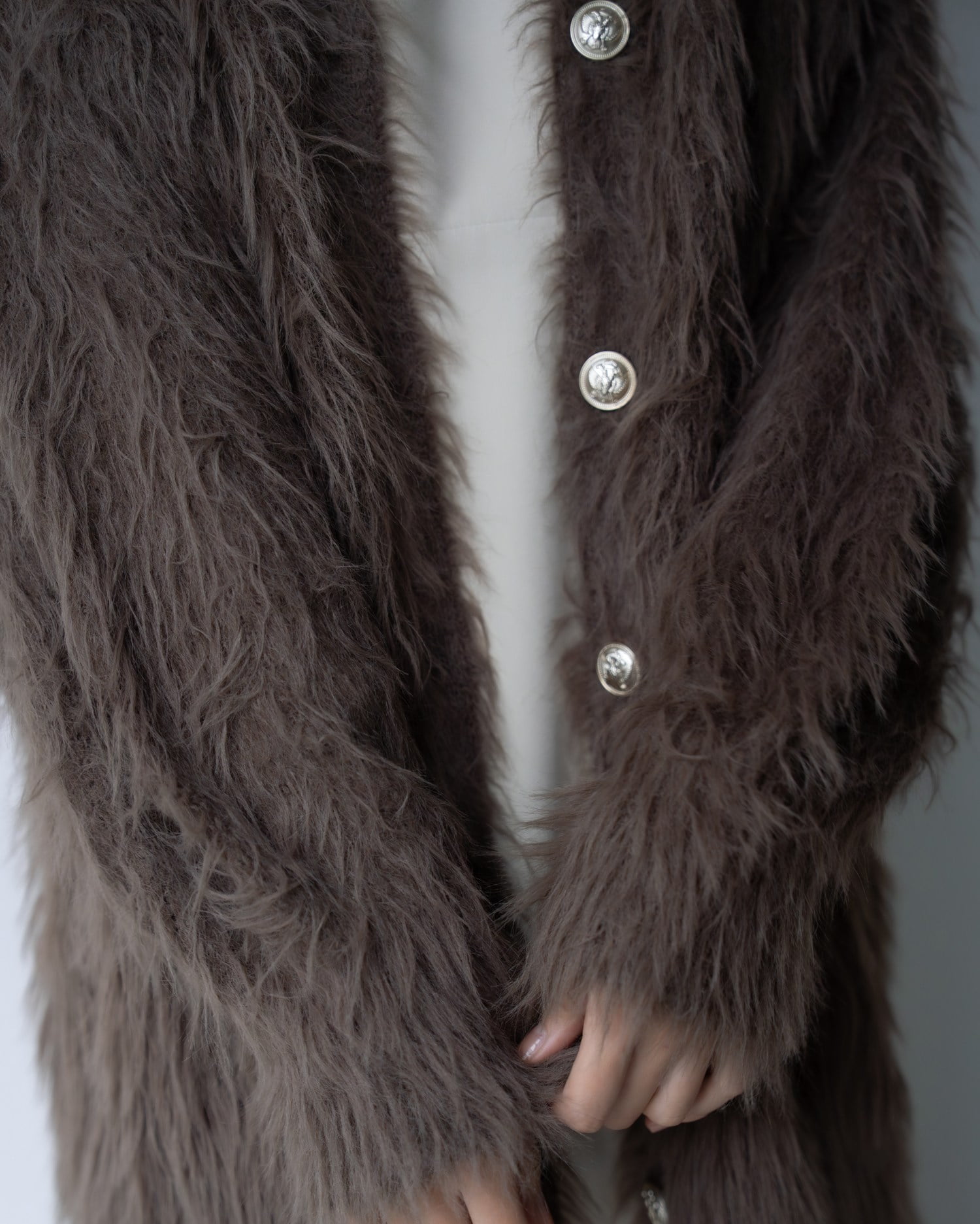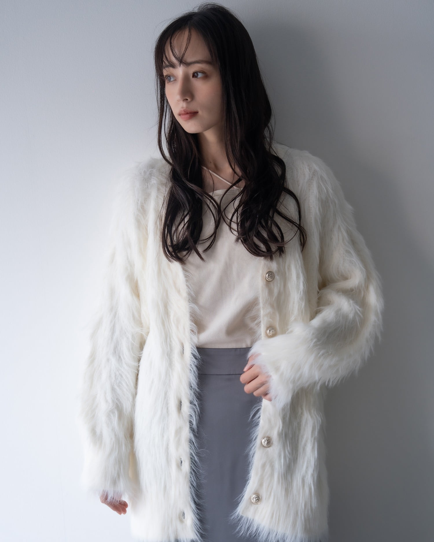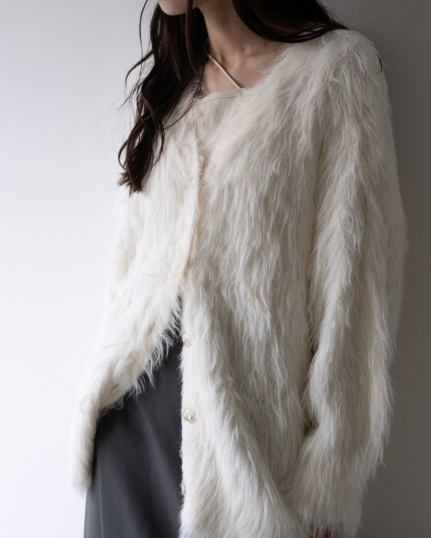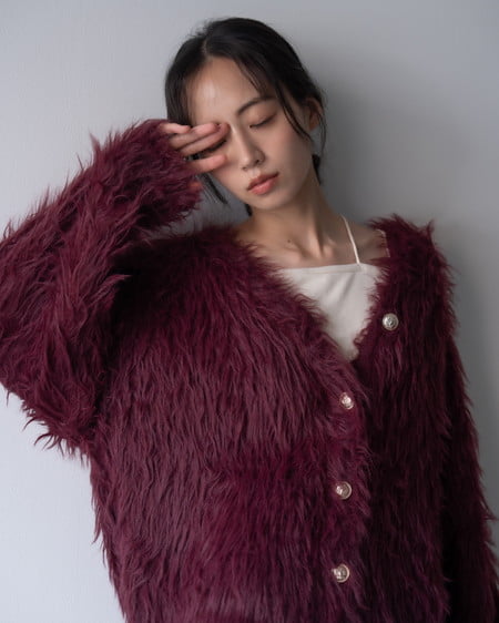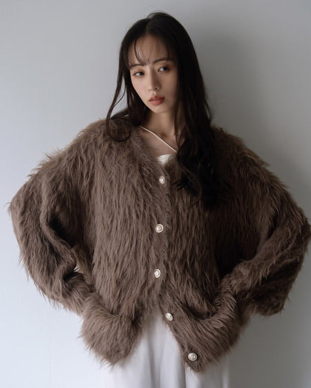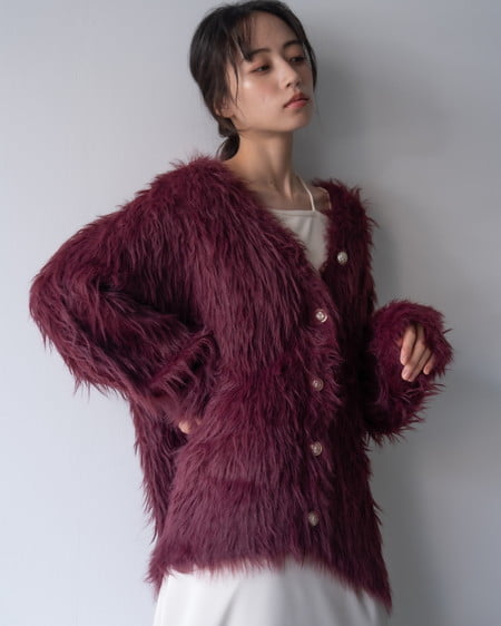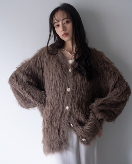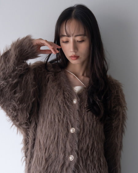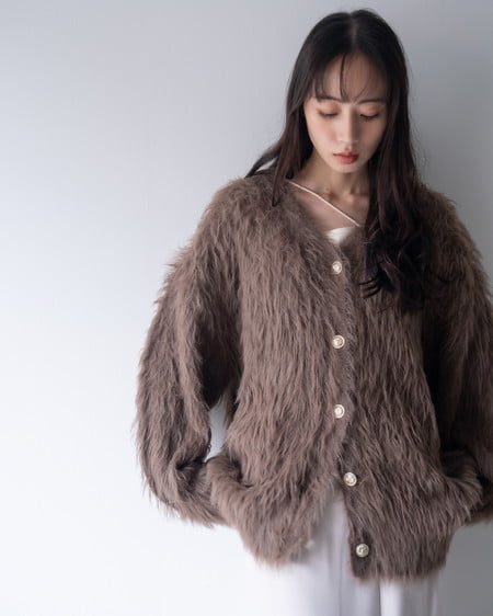 毛足の長いフェザーニットがインパクト抜群のロング丈カーディガンです。
