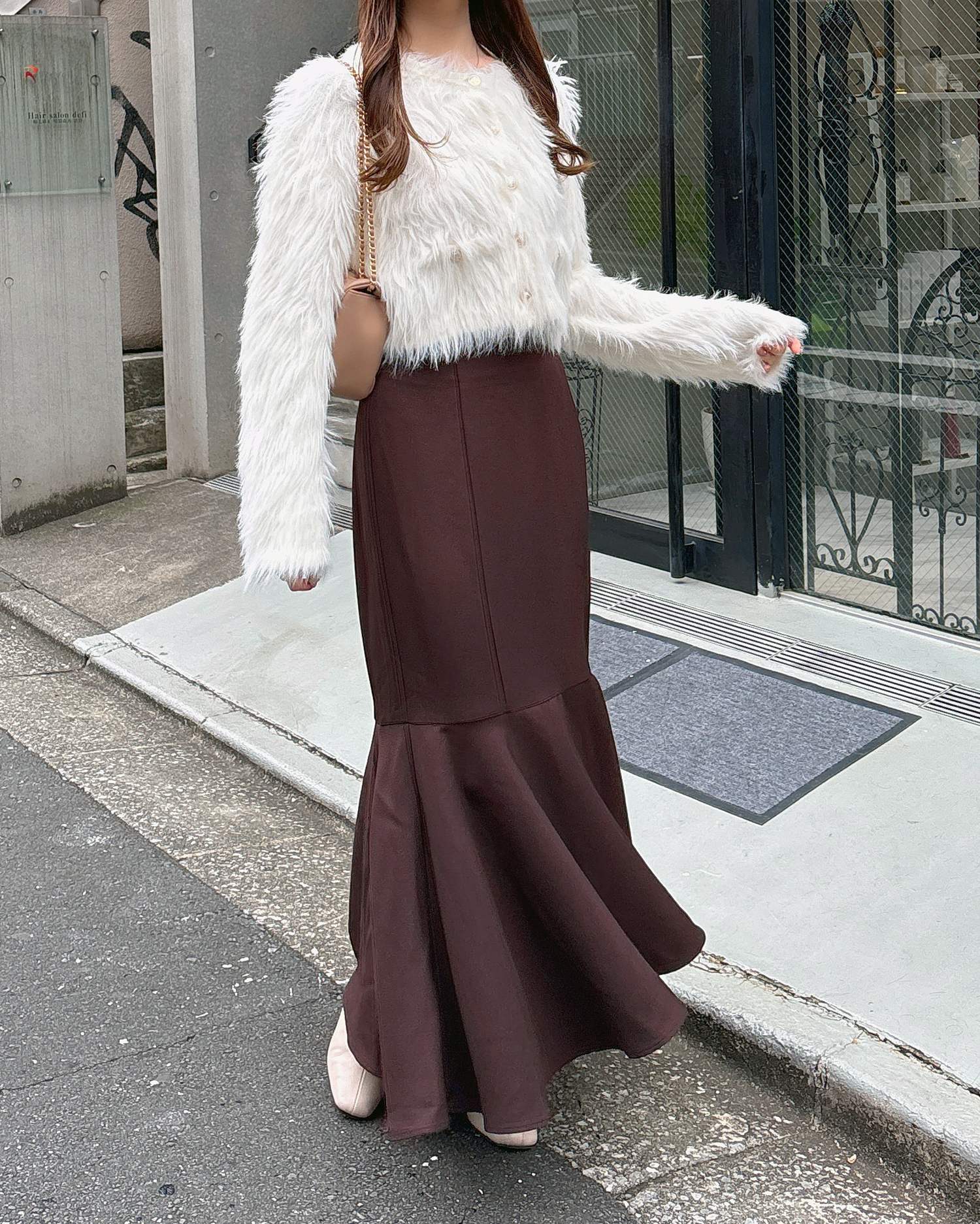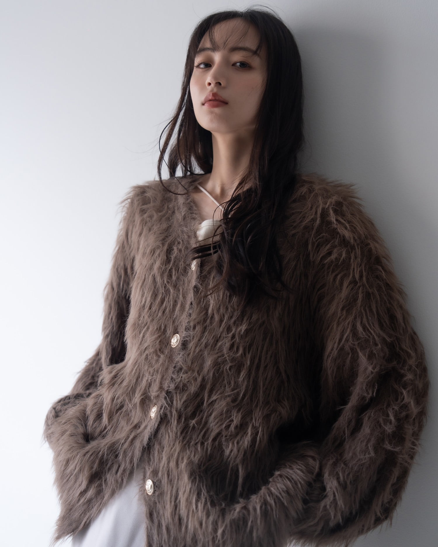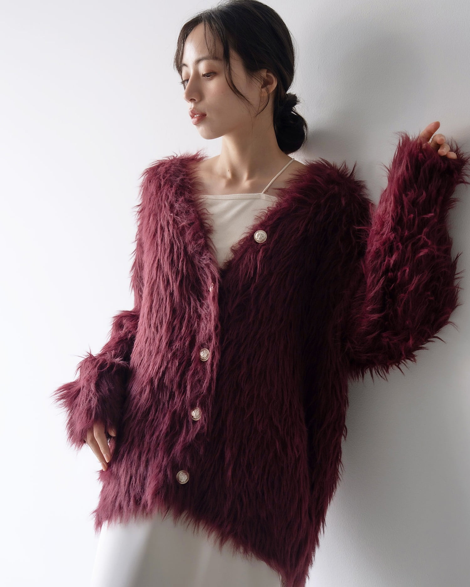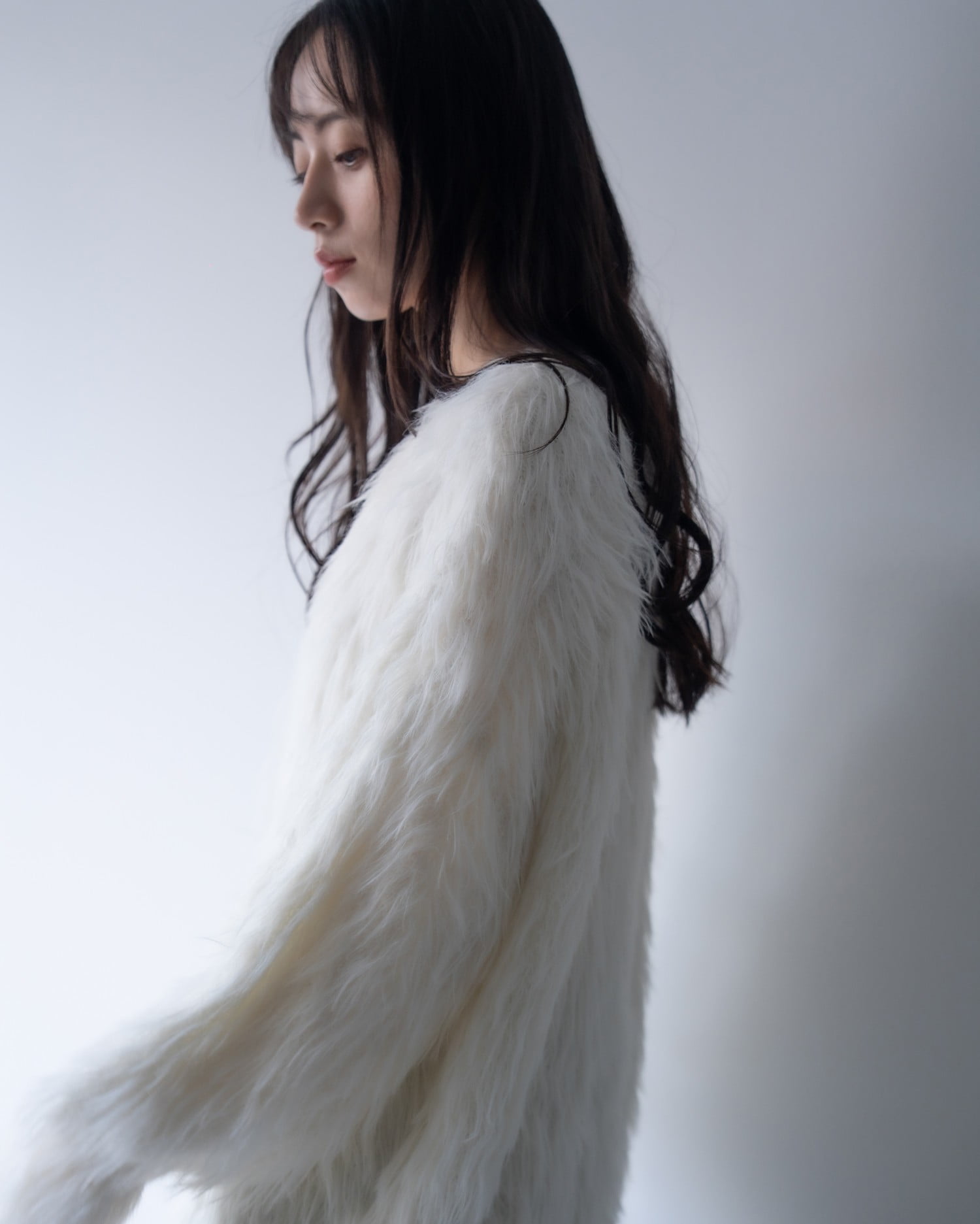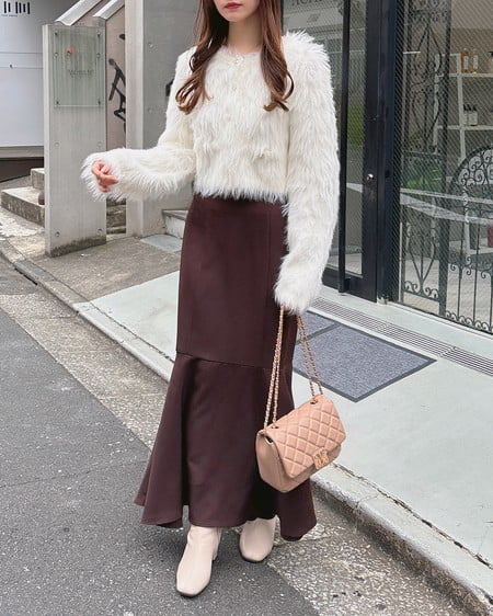 毛足の長いフェザーニットがインパクト抜群のロング丈カーディガンです。