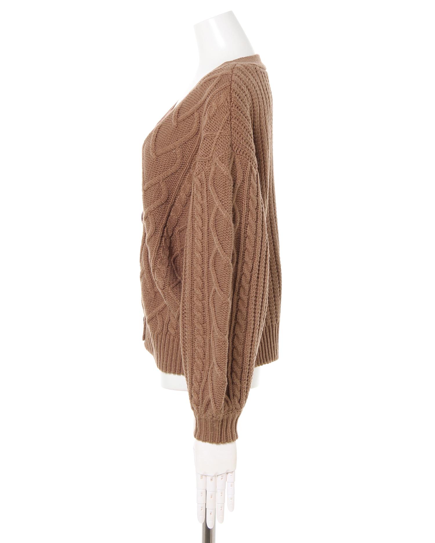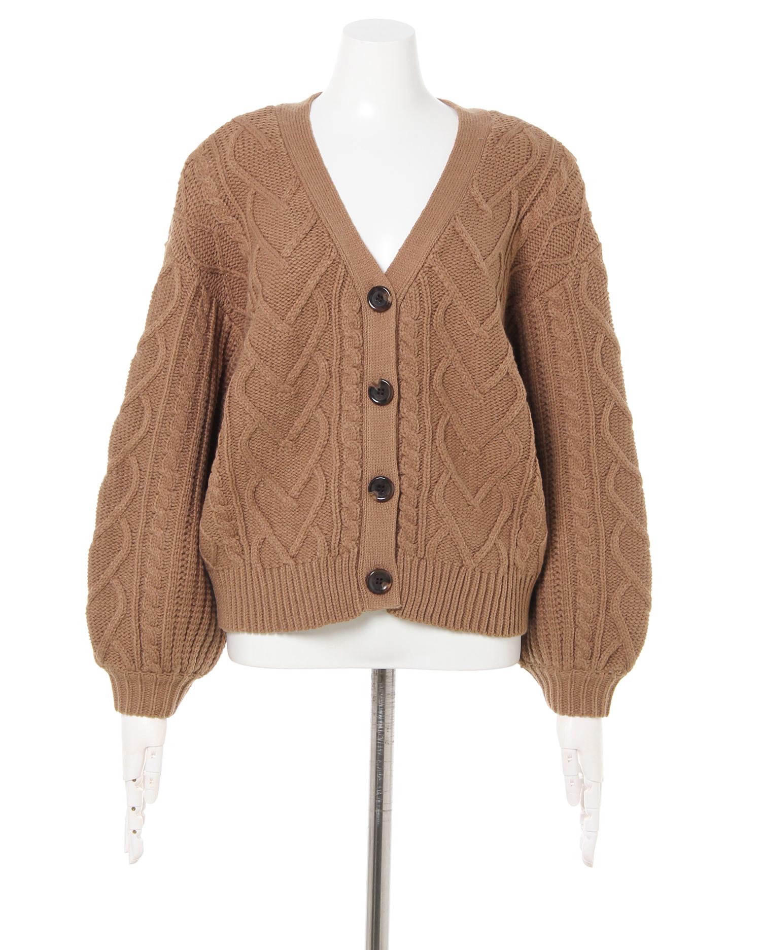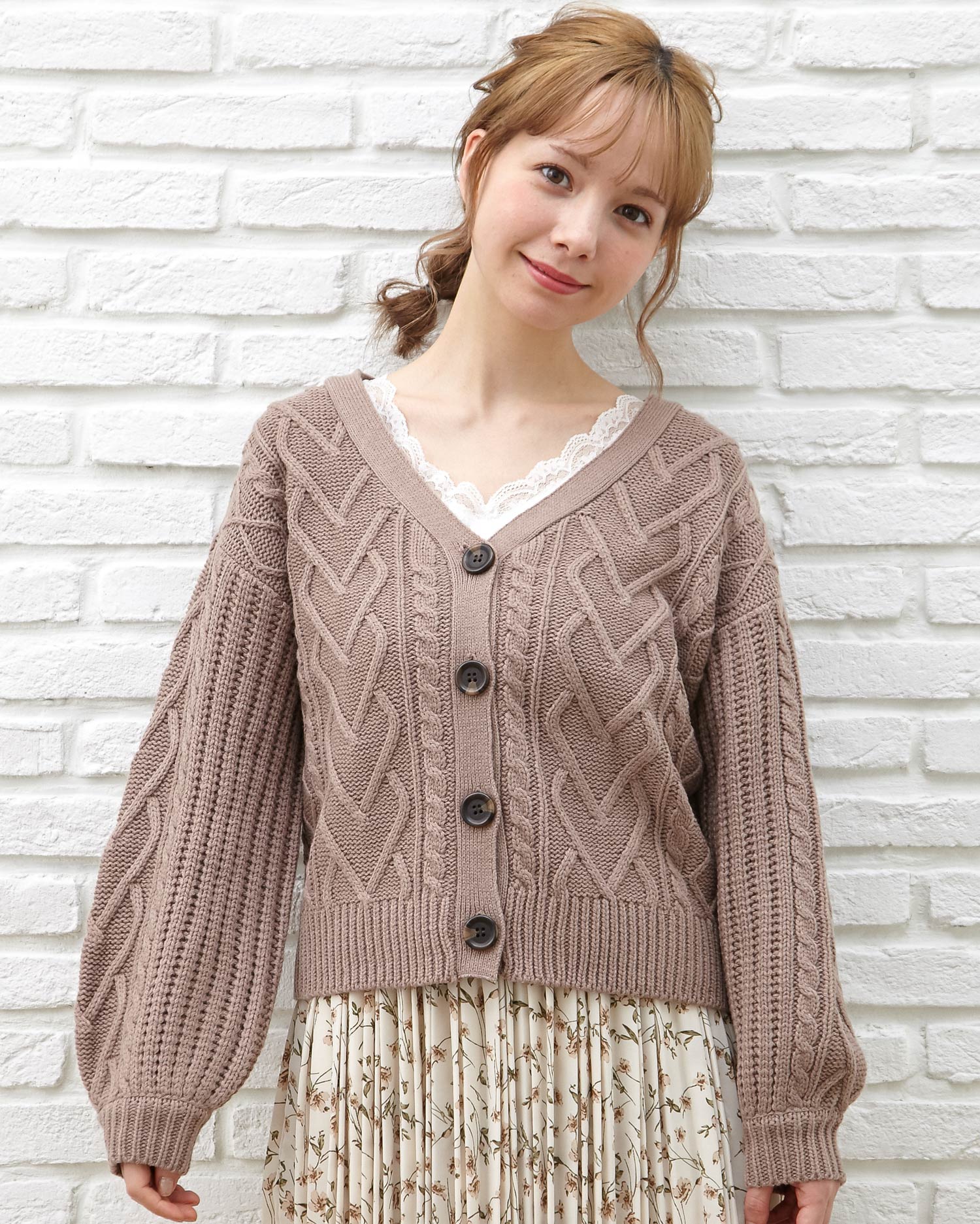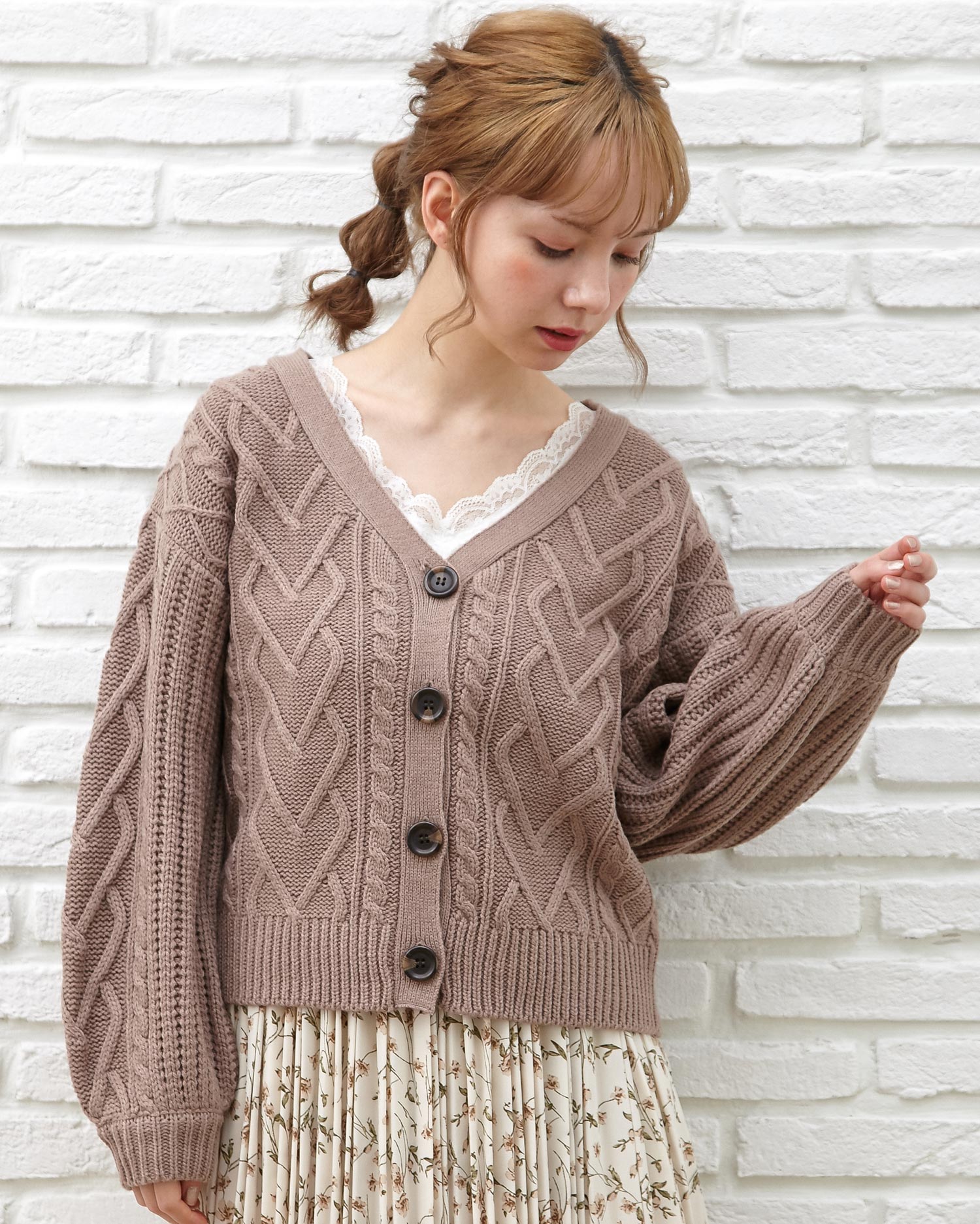 優しくナチュラルな雰囲気の立体的なケーブル編みが表情豊かなショートカーディガン。ハートモチーフの編地がアクセントになるガーリーな1枚です。ざっくりとした編地と柔らかな質感で動きやすく着心地も快適、普段使いに便利。デコルテをきれいに見せるVネックが抜け感をプラスして小顔効果も狙えます。単色で仕上げているので、コーディネイトに困らず着回し力が高い1枚。
