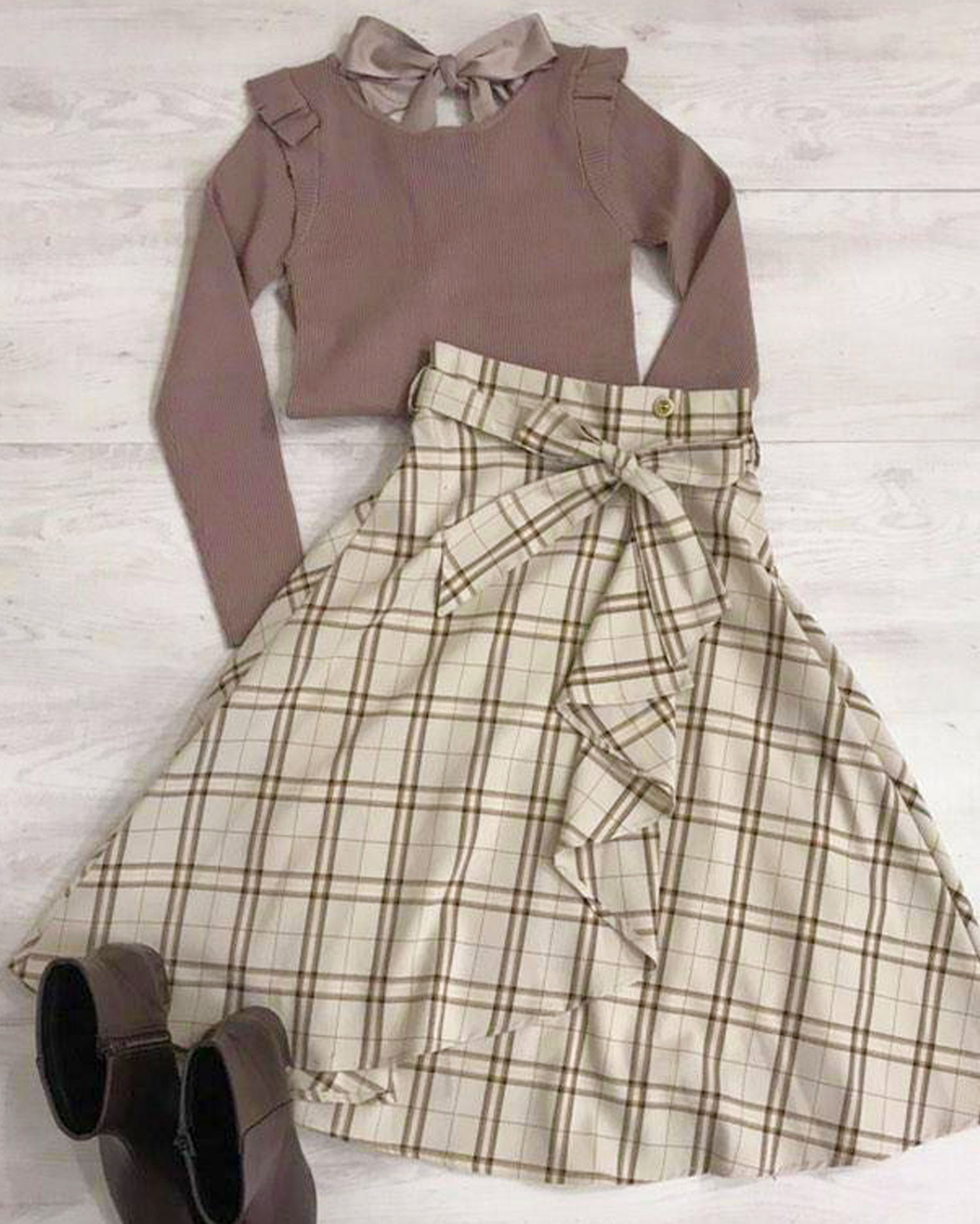 肩フリルBACKリボンニットとチェック柄ラッフルミディ/スカートのSET☆