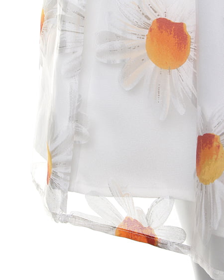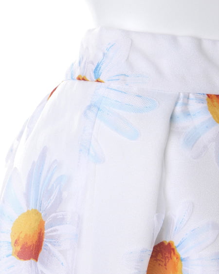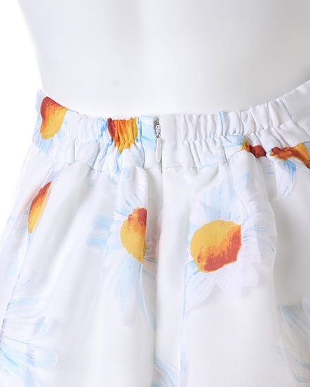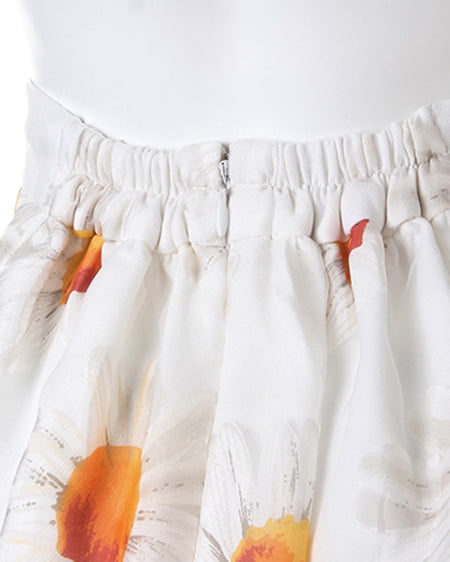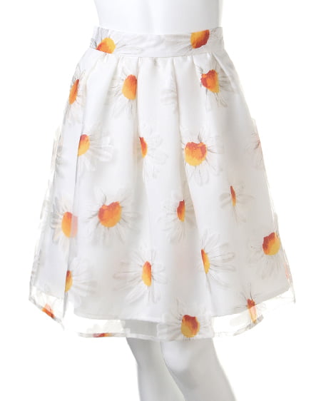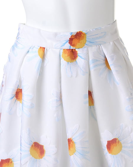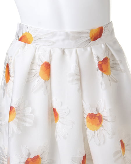フェミニンキュートなシーズンアイテム。爽やかなマーガレット柄をあしらったこだわりのスカートは女の子らしい着こなしに欠かせない一着。ふんだんにタックを入れたボリューム感のあるフレアシルエットが軽やかな印象をプラスしてくれます。ショートトップスやシアーブラウスを合わせれば季節感のある今年らしいスタイリングに仕上がります。 レギュラーより長めの着丈です。