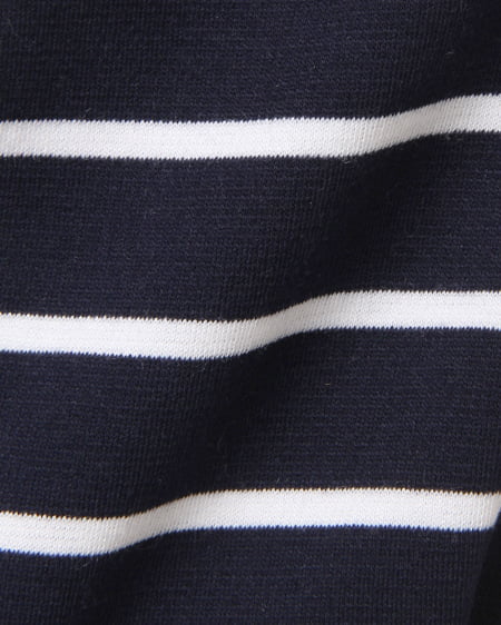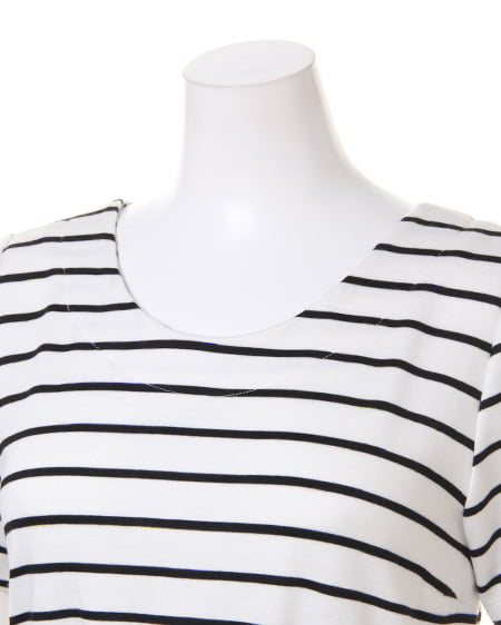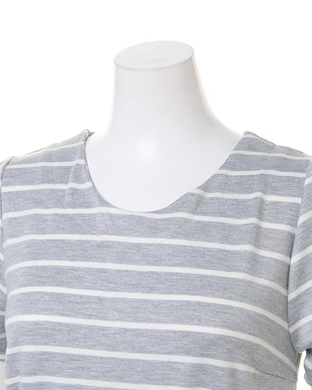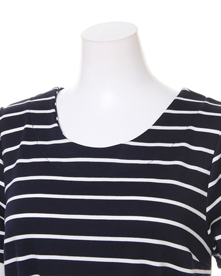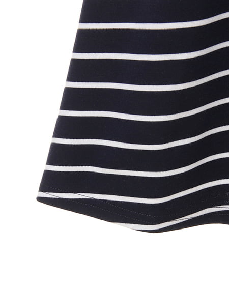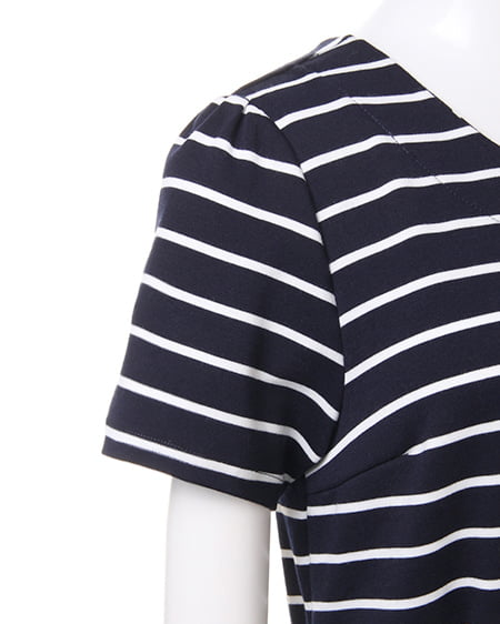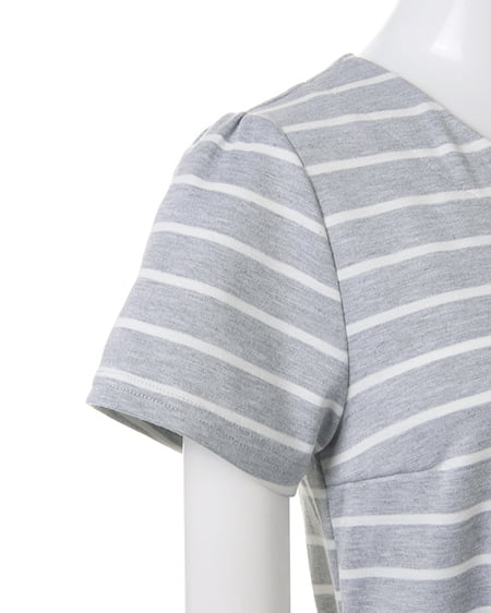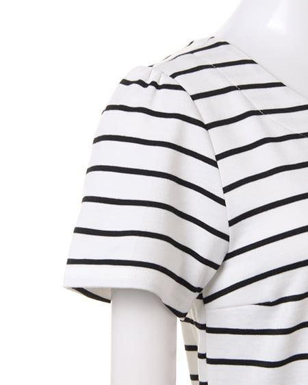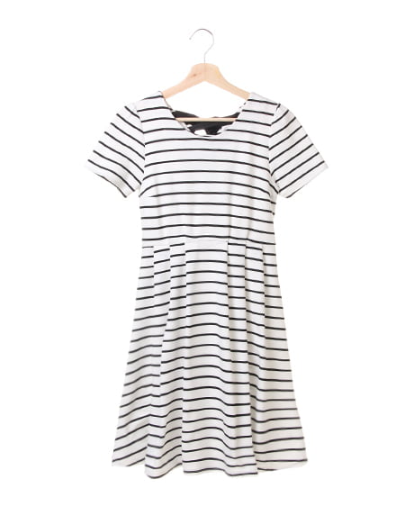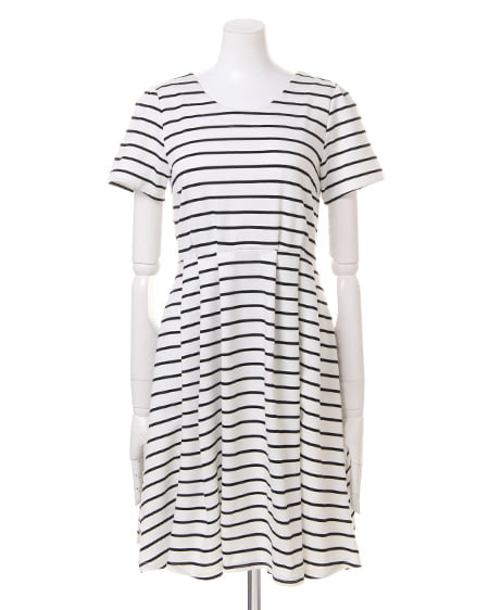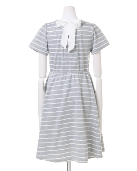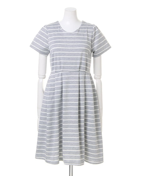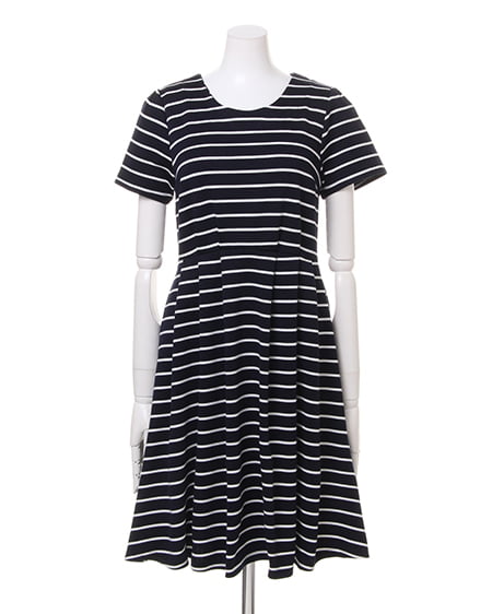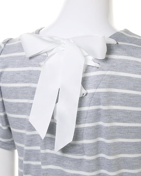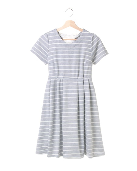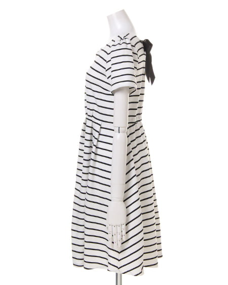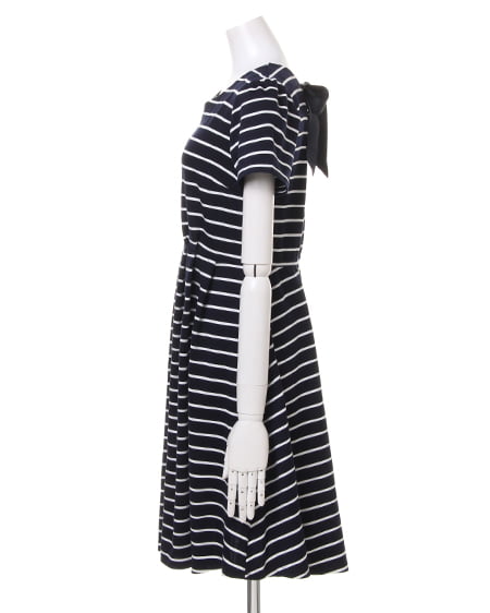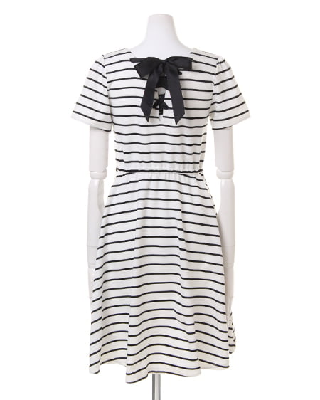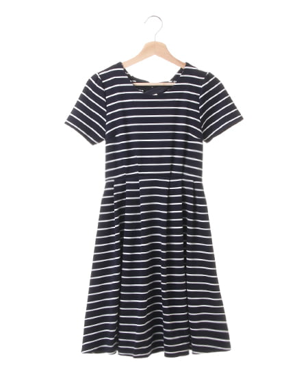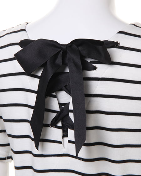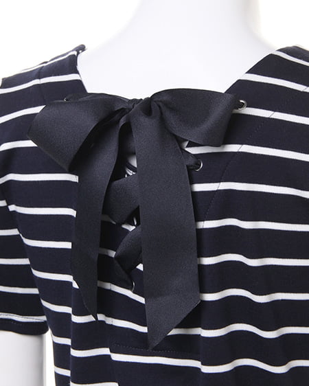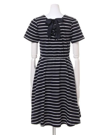 バックレースアップデザインのボーダーワンピース。カジュアルになりがちなボーダー柄も、フィット&フレアシルエットで、ほどよく上品な印象に。ウエストのタック使いでナチュラルなフレア感を表現した一枚です。レースアップになっているバックスタイルも可愛いのがポイント。短めの丈感の商品もあります。