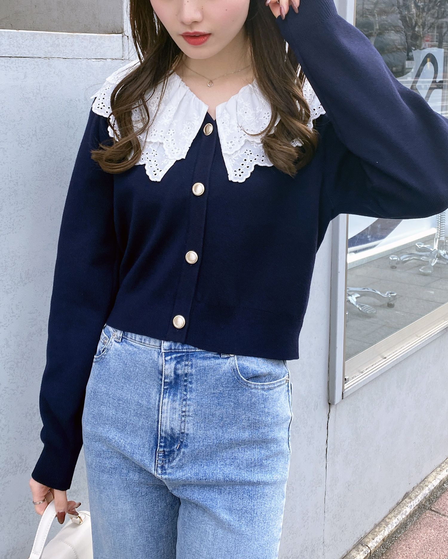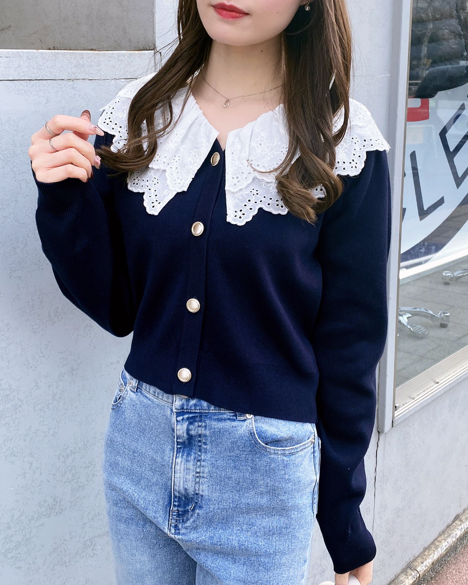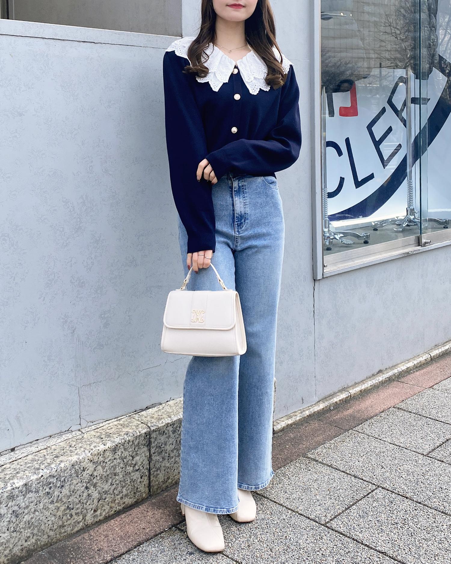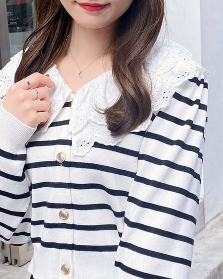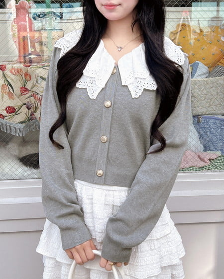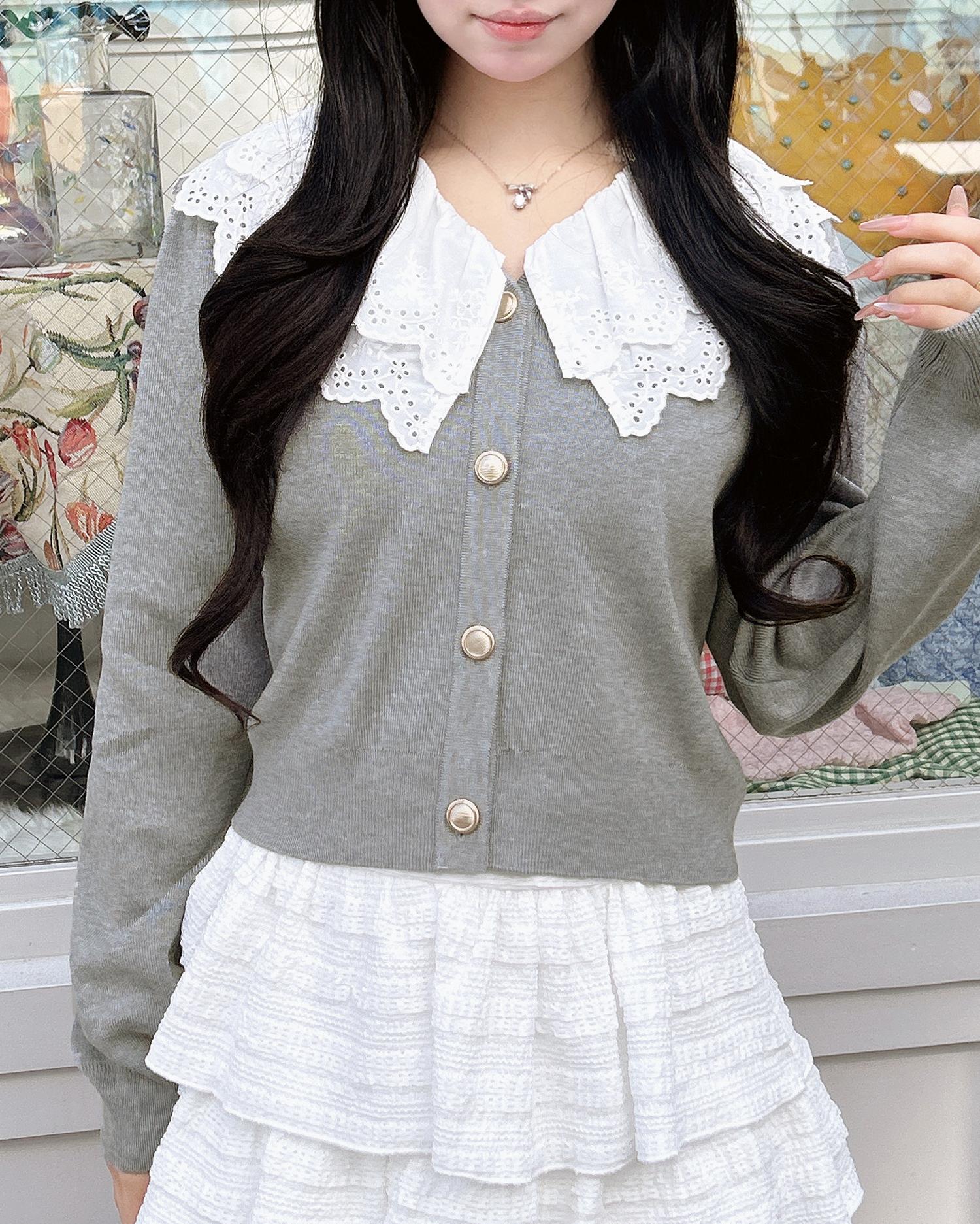ナチュラル&キュートなフリルレース襟付きのカーディガン。