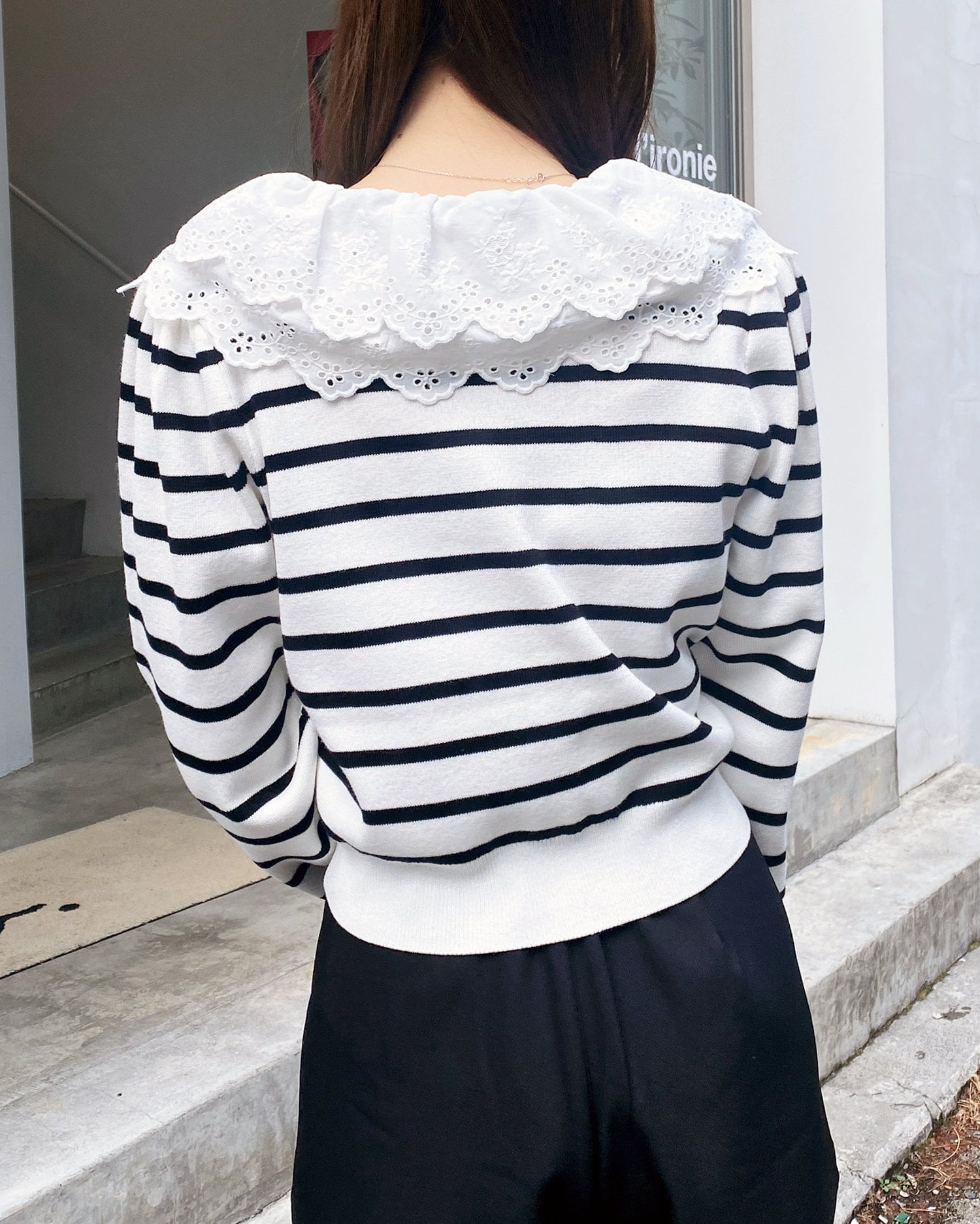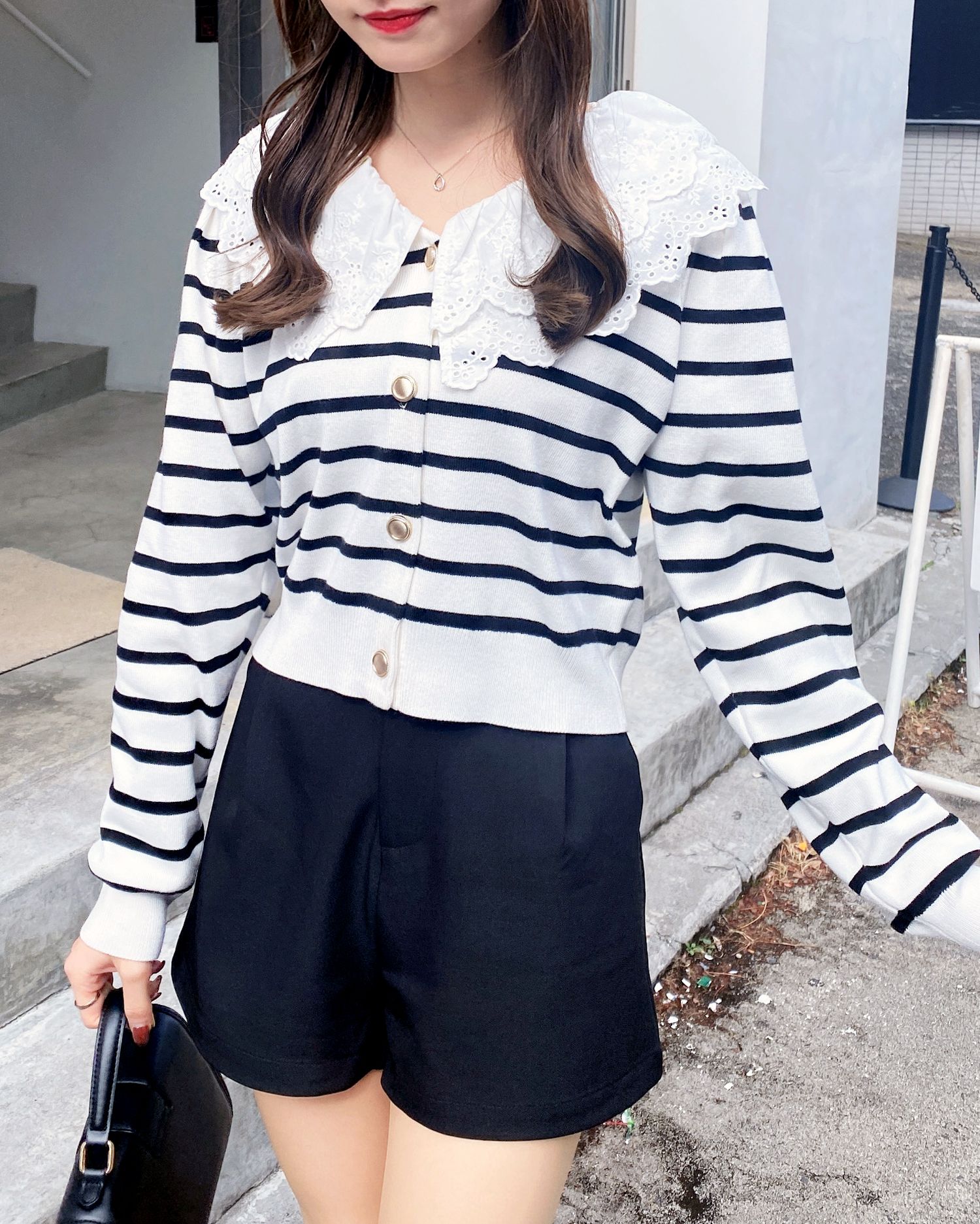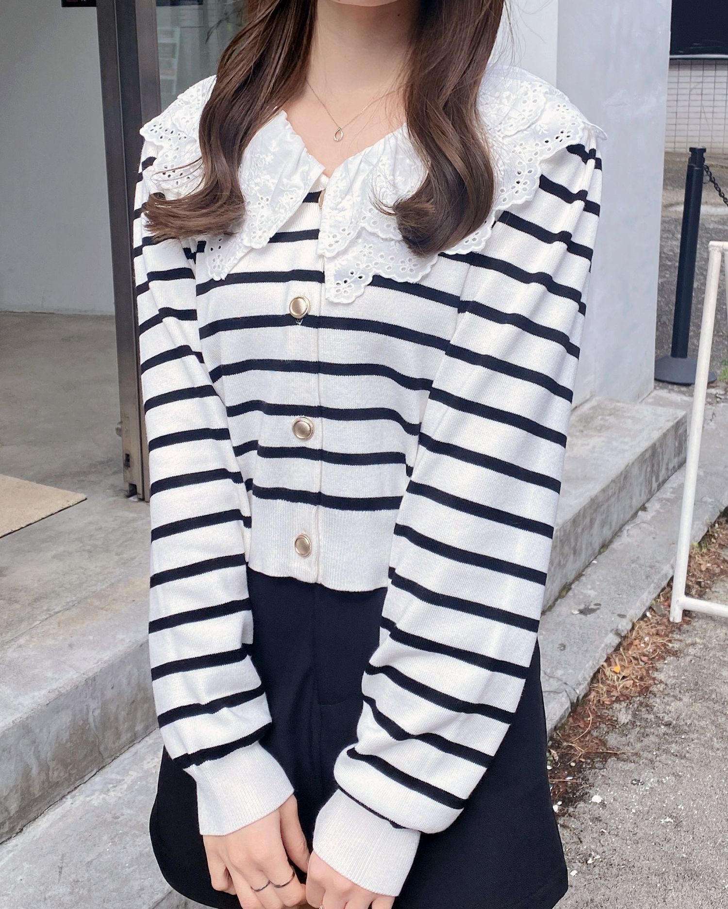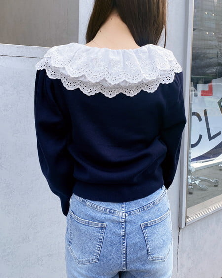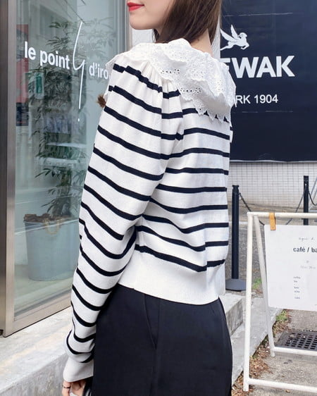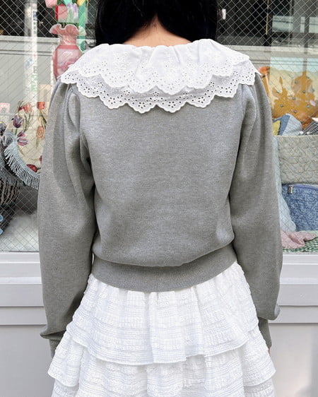 ナチュラル&キュートなフリルレース襟付きのカーディガン。