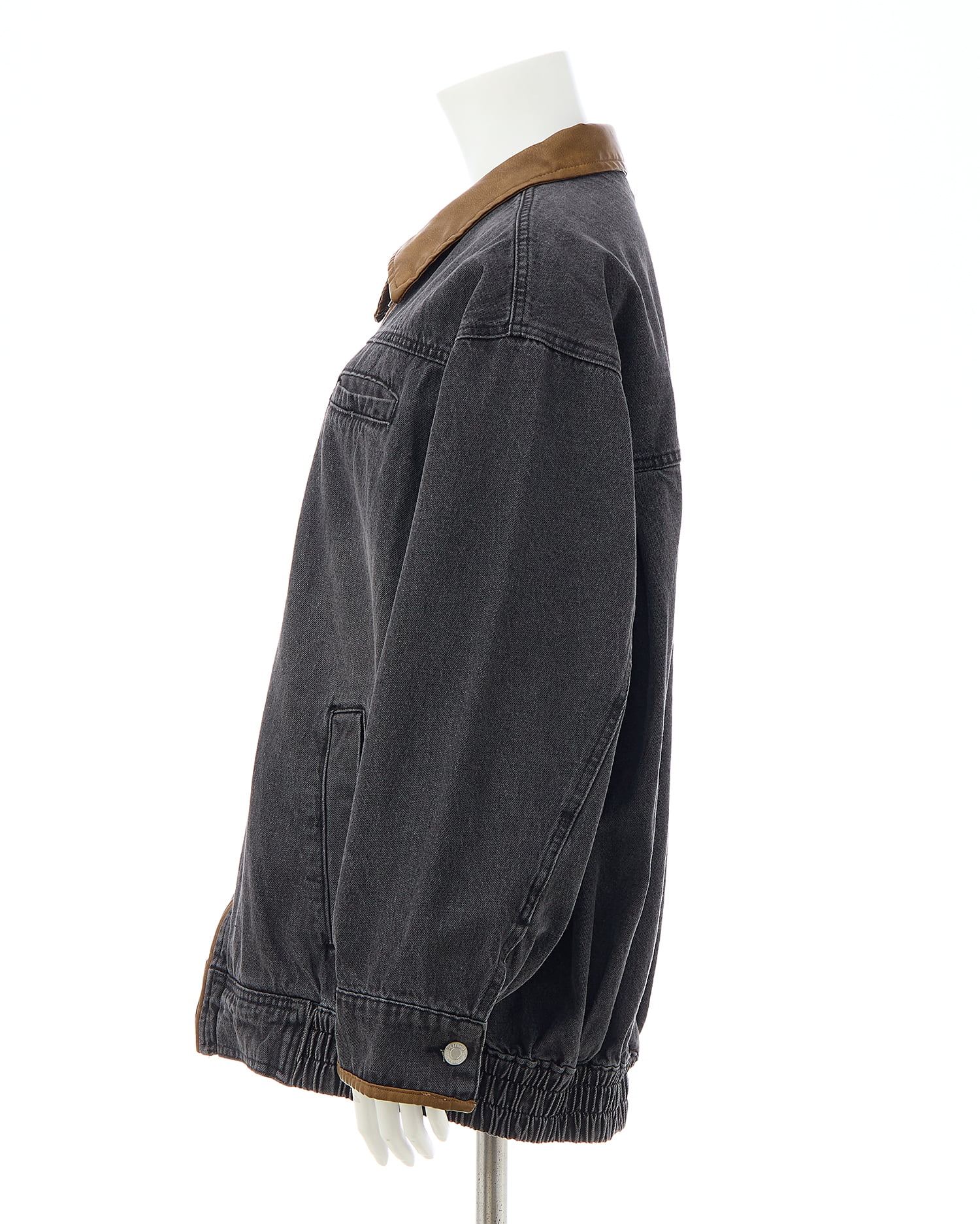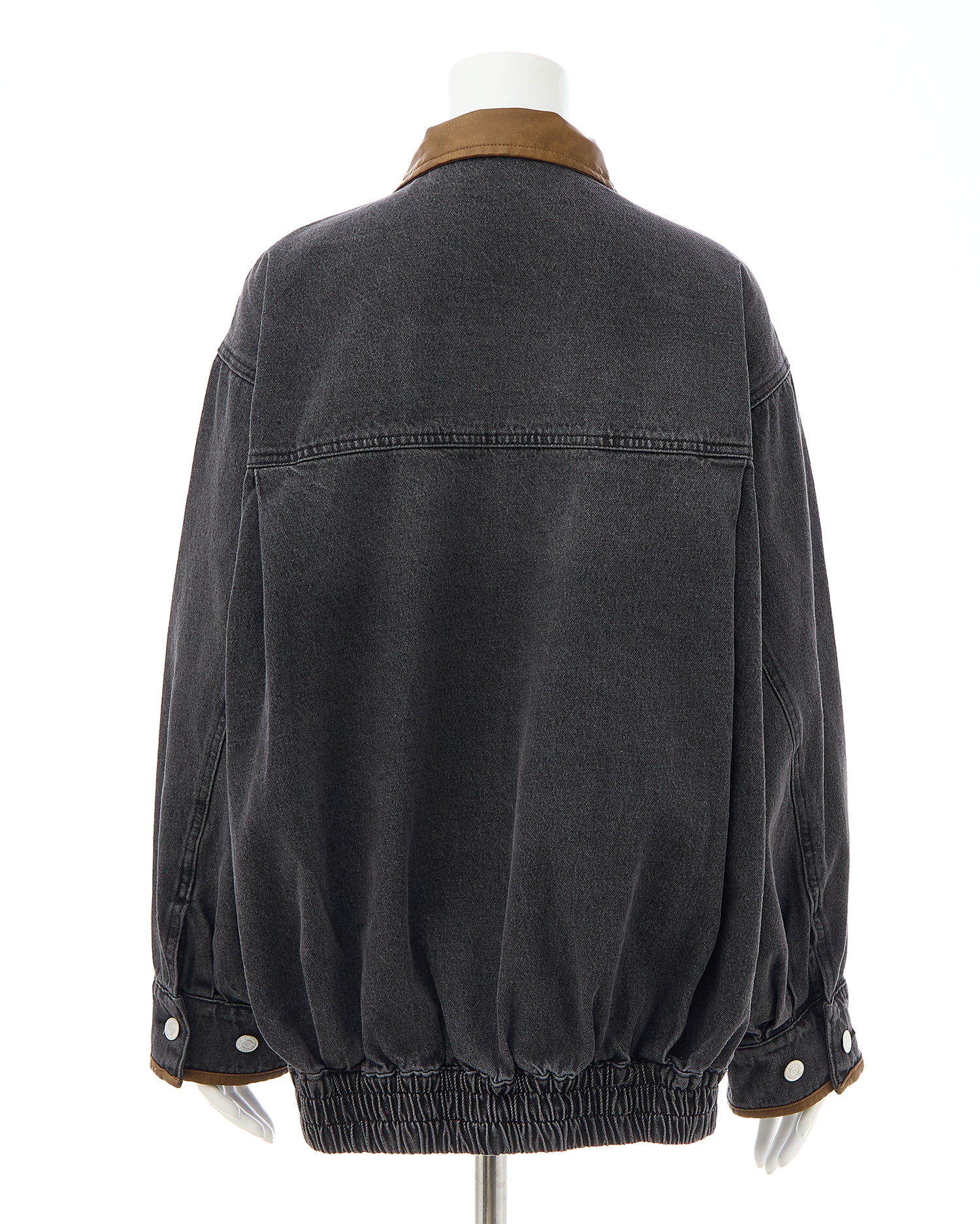 フェイクレザーで仕立てたバイカラーの襟とパイピングデザインが